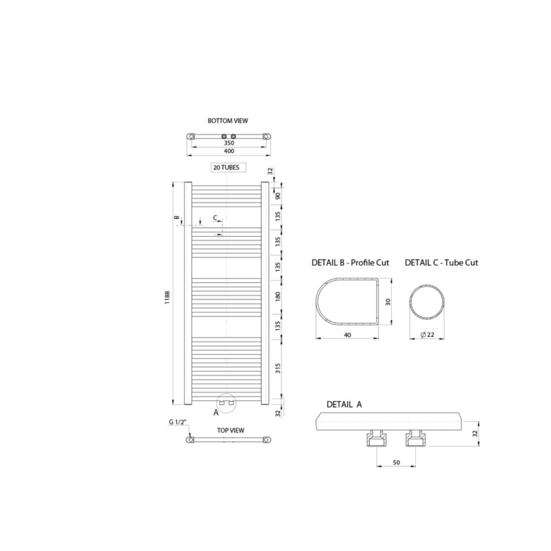 AQUALINE – ALYA vykurovacie teleso rovné 400×1188, stredové pripojenie, chróm LLS308