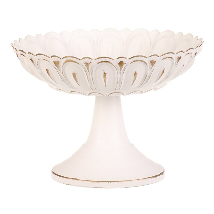 Kovová misa na stojane v bielej farbe s výškou 15 cm je skvelým aranžovacím doplnkom pre slávnostné dekorácie. Vlnitý okraj s jemnými ornamentmi dodáva eleganciu, či už ju využijete na svadbe, oslave alebo ako súčasť vianočnej výzdoby. Nadčasová dekorácia s univerzálnym využitím.Tento výrobok je určený výhradne na aranžovacie a dekoratívne účely a nie je vhodný na styk s potravinami!