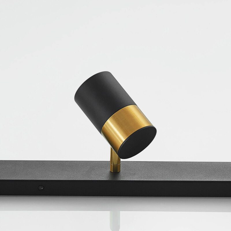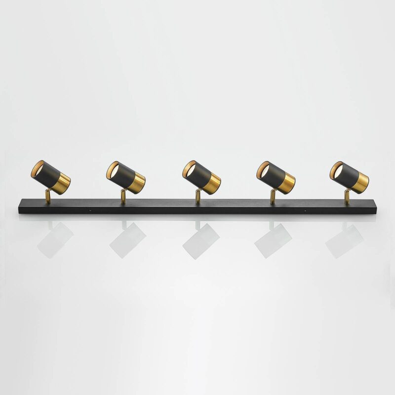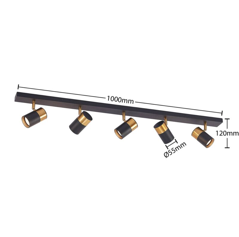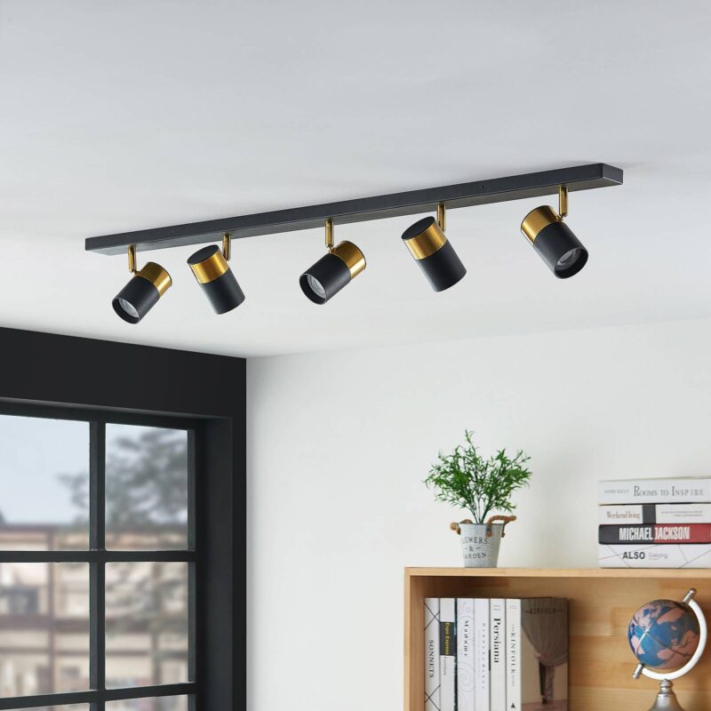 Stropný reflektor Evaro s piatimi bodmi na osvetlenie väčších priestorov Evaro je elegantný stropný reflektor, ktorý sa dokonale hodí do moderného prostredia. Má dlhý stropný držiak s celkovo piatimi bodmi. Vďaka integrovaným guľovým kĺbom sa dajú flexibilne nakláňať a otáčať, takže je možné špeciálne osvetliť určité objekty v miestnosti. Reflektor ponúka veľmi dobré osvetlenie a je vhodný najmä do väčších miestností alebo na použitie v komerčných priestoroch.