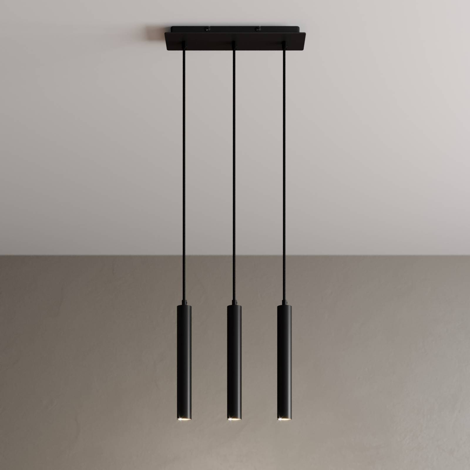 Podlhovasté trojsvetelné závesné svietidlo Franka LED s úzkymi svetelnými valcami v čiernej farbe Franka je ideálne na osvetlenie povrchov stolov alebo úzkych barových a kuchynských pultov. Tri tienidlá sú vyrobené z hliníka a majú výnimočne úzky dizajn. Estetický celkový dizajn dopĺňa sofistikovaný čierny povrch, ktorý pôsobí chladne a elegantne zároveň. Svetlo smeruje nadol a s uhlom vyžarovania 24 stupňov má tendenciu bodovo osvetľovať okolie. Vďaka trom svetelným zdrojom LED možno závesné svietidlo použiť na vytvorenie vhodnej úrovne jasu v obývacej izbe, pričom spotreba energie zostáva nízka. Výsledkom je dobrá účinnosť, ktorá je úplne v súlade s potrebami moderných spotrebiteľov – Vysoká odolnosť proti nárazu (IK08) – SDCM < 5