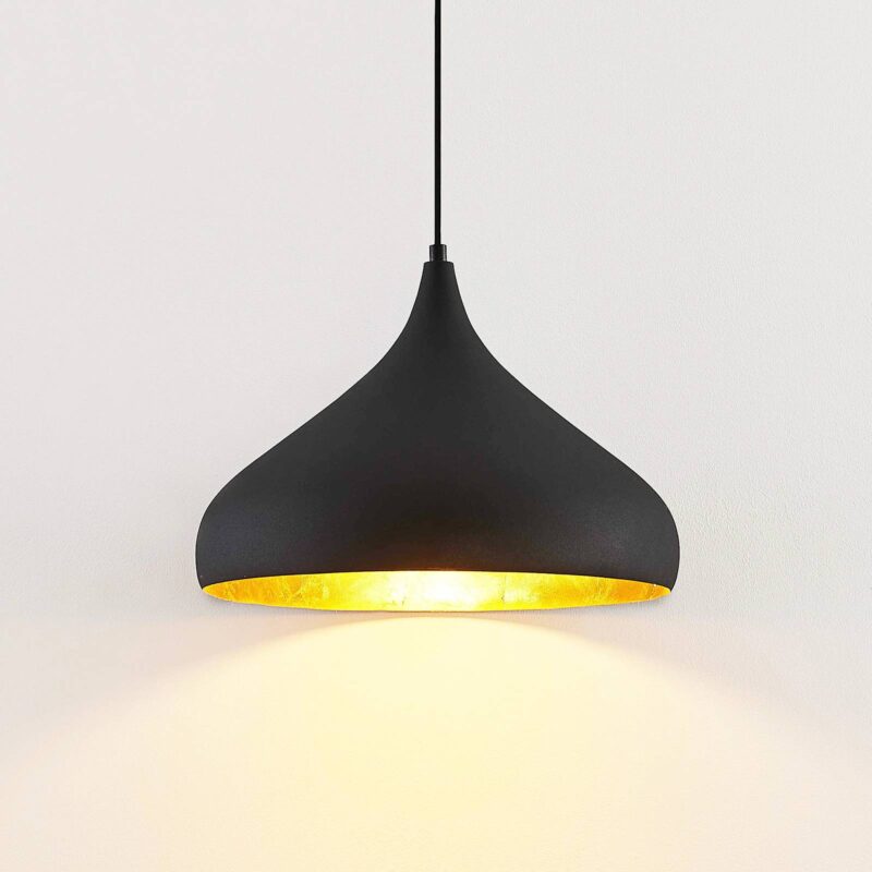 Závesné svietidlo Lunus zaujme zlatou vložkou Moderné závesné svietidlo Lunus zaujme svojim tienidlom v tvare slzy. Vonkajšia časť tienidla je matná čierna, zatiaľ čo vnútro svieti v zlatej farbe. Tieto dve farby sa navzájom dopĺňajú, aby vytvorili harmonický celkový obraz. Vďaka čiernemu exteriéru môže byť Lunus integrovaný do mnohých prostredí. Zlato dodáva žiarovke niečo isté, ale samo sa neukladá. Svetlo odráža zlato tak, aby žiara dostala teplý zlatý tón. To vytvára príjemnú a útulnú atmosféru. Lunus možno ľahko umiestniť v modernej obývacej izbe alebo nad stôl.