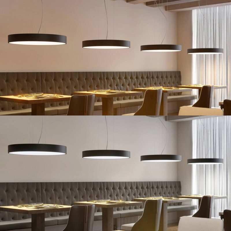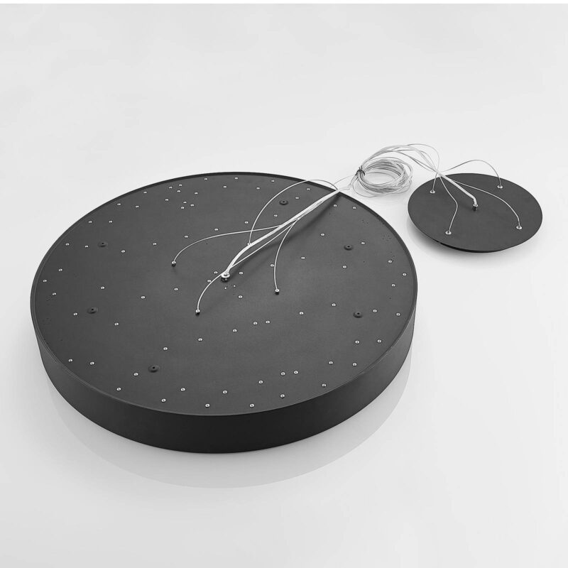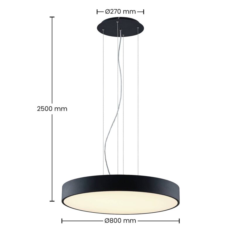 Veľké, čierne LED svietidlo s kovovým príveskom Noabelle v guľatom tvare, zmena CCT pomocou prepínača DIP Noabelle visí zo stropu na filigránových lanách a kombinuje funkčnosť s jednoduchým, ale štýlovým dizajnom. Závesné svietidlo má pomerne veľké rozmery a veľmi dobrú svietivosť, takže dokáže osvetliť aj väčšie miestnosti a plochy. Spotreba energie zostáva na porovnateľne nízkej úrovni, takže možno hovoriť o účinnom svietidle, ktoré je technicky úplne aktuálne. Za to samozrejme vďačí modernej LED technológii, v ktorej práve tieto body jednoznačne patria medzi výhody a ktoré sa vyznačujú tiež dlhou životnosťou a dobou svietenia. Minimalistický dizajn sa hodí rovnako dobre do bytových priestorov, ako aj do komerčného prostredia a skutočnosť, že počas inštalácie môžete nastaviť farbu svetla, zvyšuje možnosti použitia. Teplé biele svetlo pôsobí obzvlášť útulne, zatiaľ čo biele svetlo je vhodnejšie na sústredenú prácu. Jedálenské a pracovné stoly sú dobrými oblasťami použitia veľkej okrúhlej LED závesnej lampy s čiernym kovovým tienidlom a bielym plastovým difúzorom, ktorý umožňuje rovnomerné svetlo.