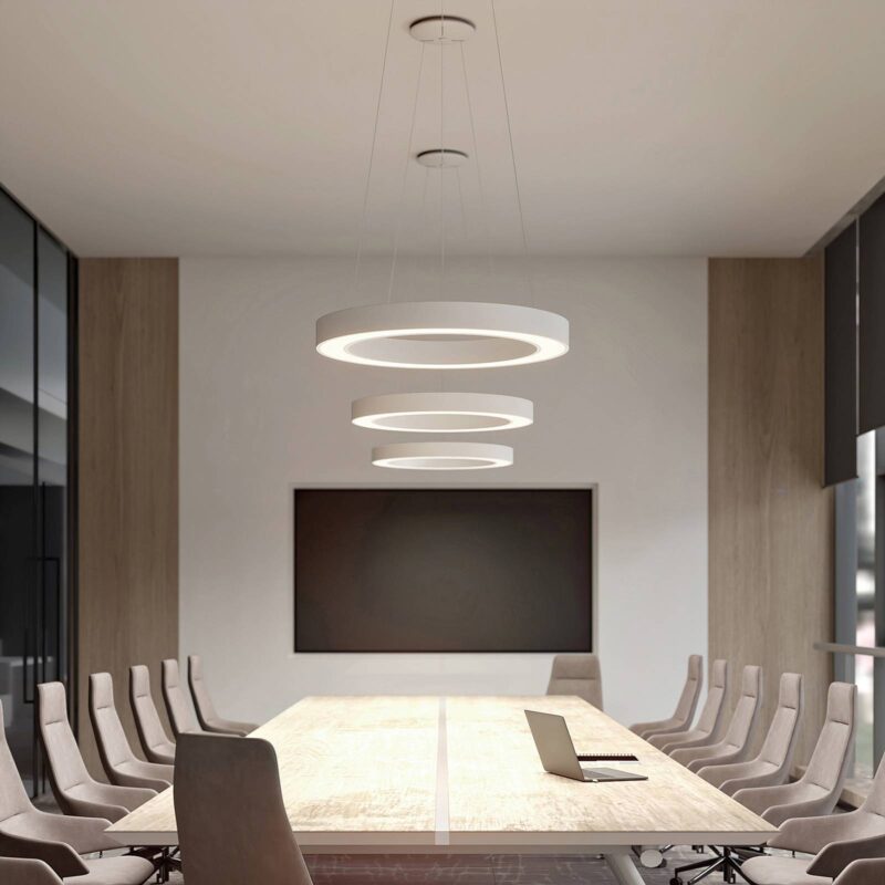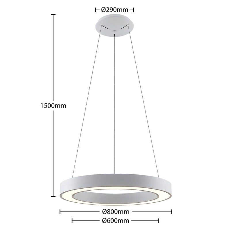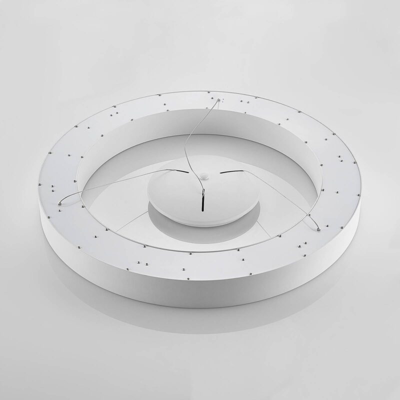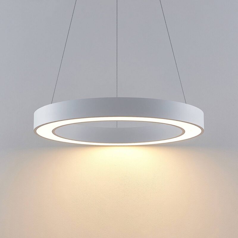 Závesné svietidlo Sharelyn LED v tvare kruhu v bielej farbe s filigránovým drôteným závesom, nastaviteľná farba svetla Sharelyn je závesné svietidlo s pomerne veľkými rozmermi, a preto sa dá dobre použiť aj v komerčnom prostredí, najmä preto, že svietivosť LED diód je mimoriadne vysoká a poskytuje jasné svetlo s pomerne nízkou spotrebou energie. Svietidlo, ktoré visí zo stropu na úzkych drôtených kábloch, sa dá použiť aj ako osvetlenie nad stolom v rokovacej miestnosti, ale je samozrejme vhodné aj ako osvetlenie kuchyne, aby tamojší stôl mal dobrý jas. Dizajn pôsobí vždy moderne a jednoduchý prstencovitý tvar v kombinácii s bielou povrchovou úpravou pripomína klasické kuchynské lampy z dávnejších čias, prirodzene ako módna reinterpretácia známeho vzhľadu. Pred inštaláciou sa farba svetla dá nastaviť pomocou DIP prepínača a v závislosti od účelu si môžete vybrať medzi teplým bielym alebo univerzálnym bielym svetlom.