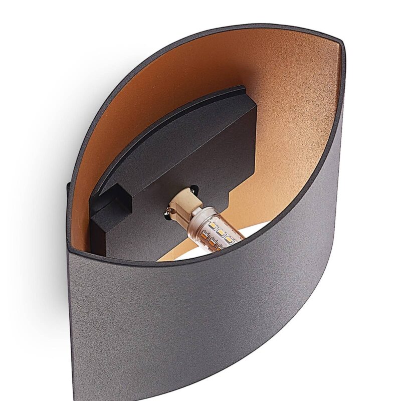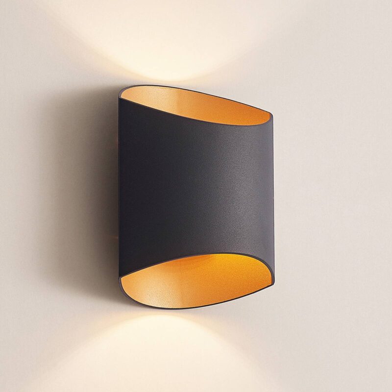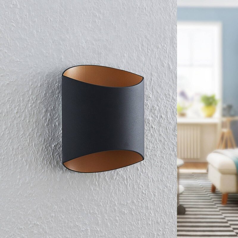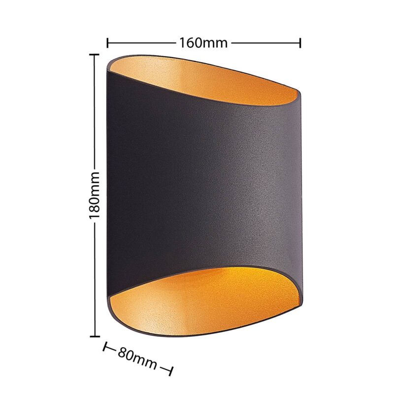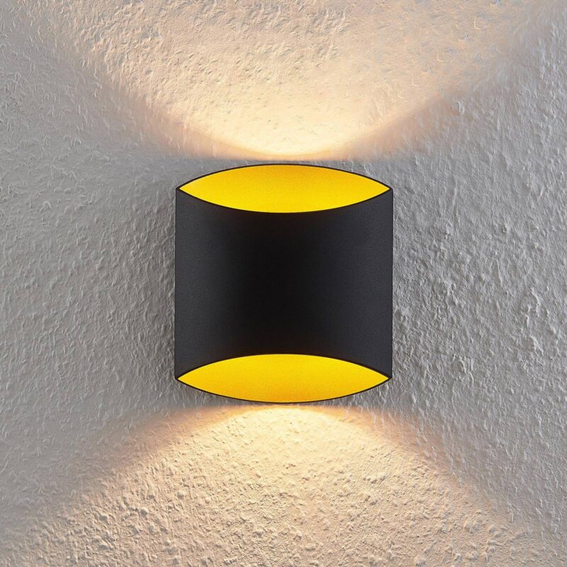Nástenné svietidlo oválneho tvaru Vilja vyrobené z hliníka v čiernej a zlatej farbe Moderné nástenné svietidlo Vilja presvedčí štíhlym dizajnom a osviežujúcim sfarbením. Jeho telo je vyrobené z hliníka a jeho exteriér je natretý čiernou farbou, zatiaľ čo jeho interiér je zobrazený v zlatej farbe. Ak použijete správny zdroj svetla, tienidlo oválneho tvaru vytvorí osvetlenie bez oslnenia, ktoré je obzvlášť vhodné pre chodby. Generované svetlo sa uvoľňuje hore a dole a vytvára zaujímavý svetelný vzor. Sviežu farebnú schému čiernej a zlatej farby je možné ľahko integrovať do moderných štýlov vybavenia a zvýrazniť steny. Vďaka svojmu kompaktnému dizajnu je nástenné svietidlo Vilja priestorovo úspornejšie ako veľké nástenné svietidlo, a preto sa hodí aj do úzkych miestností.