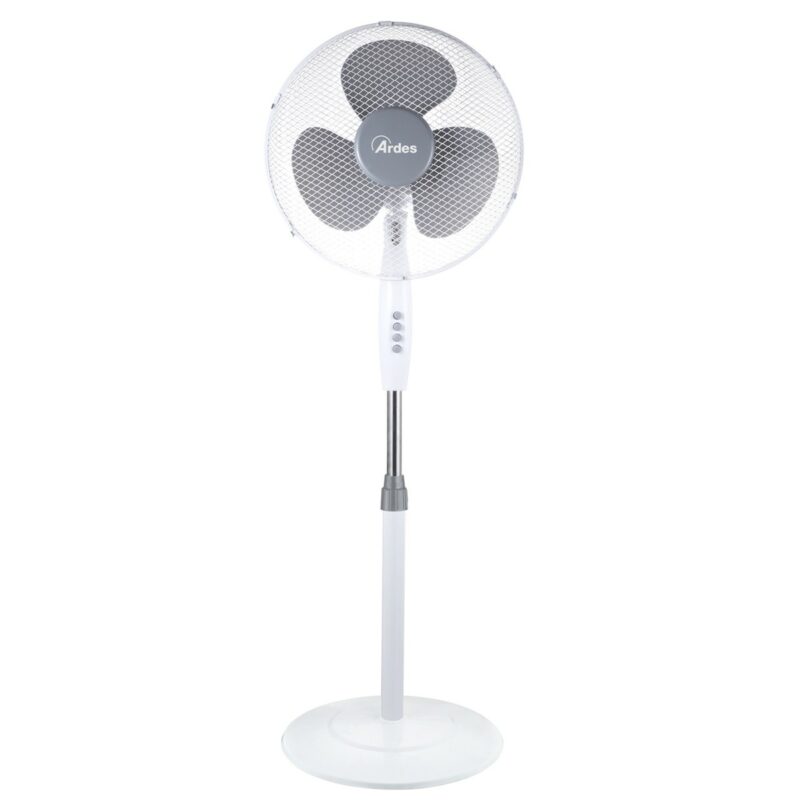 Stojanový ventilátor od výrobcu Ardes sa skvele hodí do horúcich letných dní. Priemer jeho vrtulí je 40 cm a sú v polopriehľadnom sivom prevedení. Má širokú kruhovú základňu. Obsahuje ochrannú mriežku. Disponuje 3 rýchlosťami a automatickou osciláciou. Celý prístroj je v bielej a sivej farbe.