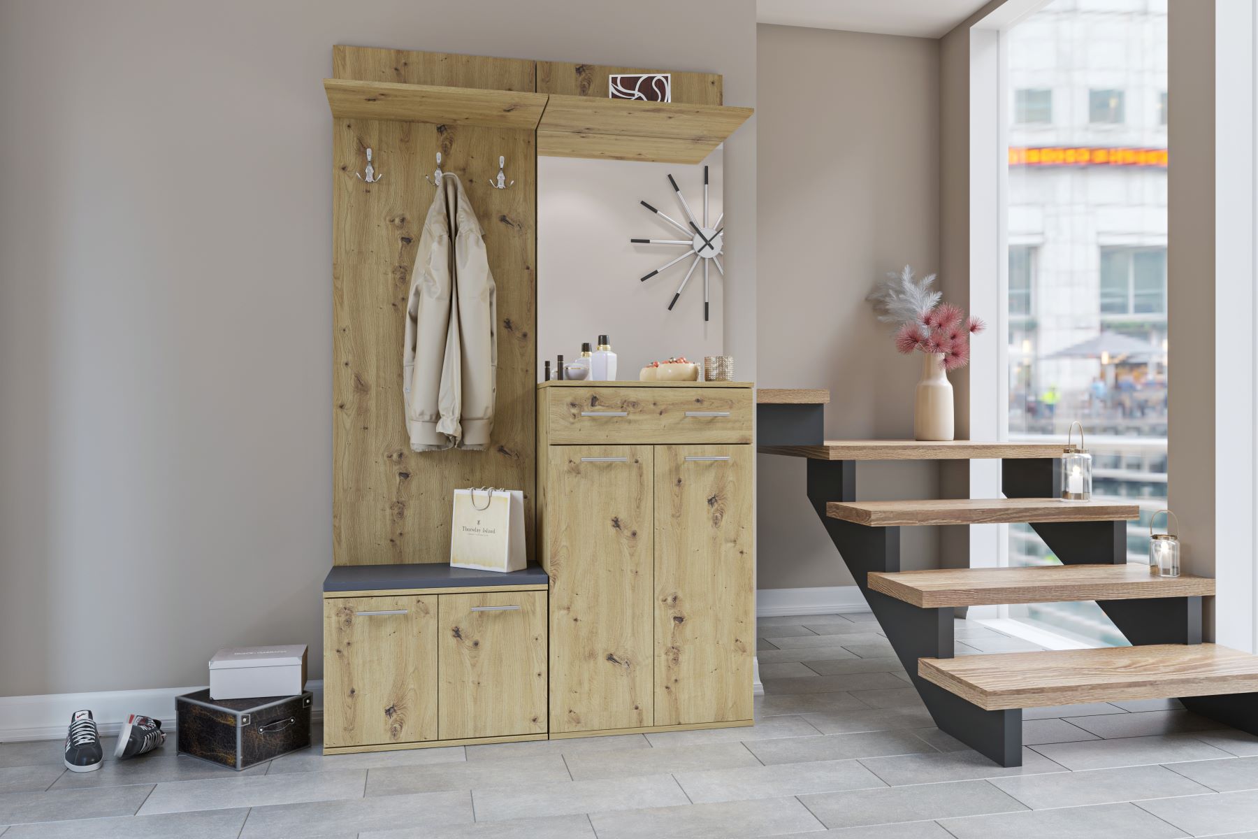 Predsieň ARMADIO v modernom farebnom prevedení. Súčasťou predsiene je fazetové zrkadlo, vešiak, skrinky na topánky, vankúšik. Nábytok je vyrobený z ľahkoudržiavateľnej LTD dosky.Farebné prevedenie dub artisan.Rozmery zostavy v/š/h 203 x 120 x 32 cm.Rozmery jednotlivých dielov.- panel s vešiakom š/v/h 60,2 x 156,3 x 28 cm,- panel so zrkadlom 60,2 x 106,5 x 28 cm,- komoda so zásuvkou 60,2 x 96,4 x 32 cm- komoda 60,2 x 46,3 x 32 cm. Dodávané v demonte.