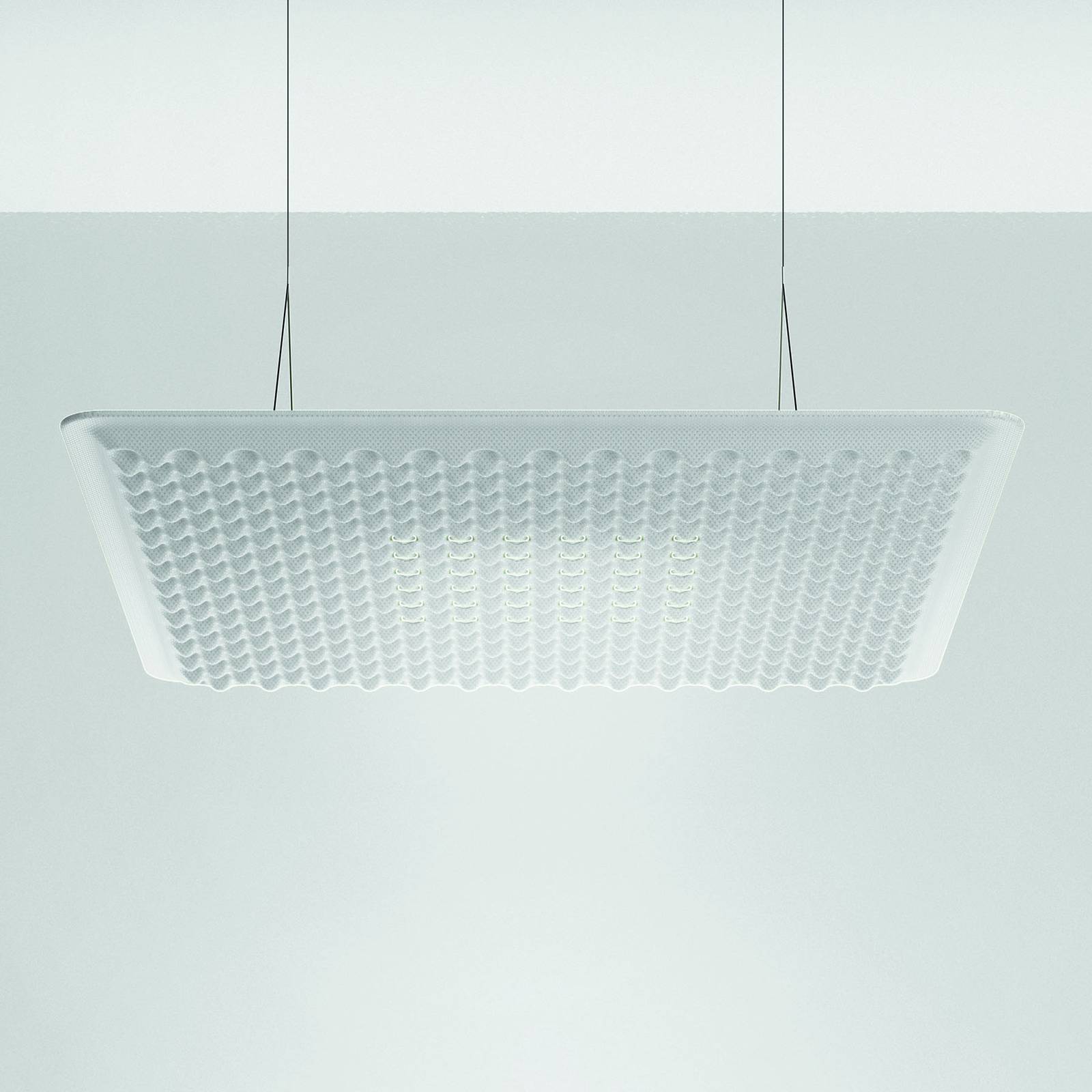 Kancelárske závesné svietidlo Eggboard Matrix vo formáte 80 x 80 cm – priame a nepriame svetlo, pohlcujúce zvuk Materiál závesného svietidla LED Eggboard Matrix má zvukovo pohltivé vlastnosti, ktoré sú ešte umocnené sinusoidálnou štruktúrou povrchu. To podporuje akustiku miestnosti, ktorá uľahčuje vzájomné porozumenie počas rozhovorov a zabezpečuje akustickú účinnosť. Eggboard Matrix poskytuje nepriame svetlo cez strop aj priame osvetlenie úloh. To má vďaka rotosymetrickým reflektorom a množstvu jednotlivých LED diód homogénny a príjemný efekt. Závesné svietidlo Eggboard Matrix LED vyvinula spoločnosť Progetto CMR a vyrába ho talianska spoločnosť Artemide, ktorá je od svojho založenia v roku 1960 Ernestom Gismondim synonymom výrobkov, ktoré z hľadiska dizajnu a funkčnosti nenechávajú nič na náhodu. Filozofia spoločnosti Artemide vytvárať osvetlenie prispôsobené potrebám človeka je obzvlášť jasne stelesnená v systéme Eggboard Matrix – externe stmievateľnom systéme DALI