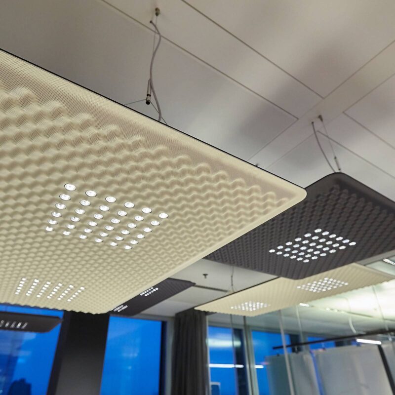 Kancelárske závesné svietidlo Eggboard Matrix vo formáte 80 x 80 cm – priame a nepriame svetlo, pohlcujúce zvuk Materiál závesného svietidla LED Eggboard Matrix má zvukovo pohltivé vlastnosti, ktoré sú ešte umocnené sinusoidálnou štruktúrou povrchu. To podporuje akustiku miestnosti, ktorá uľahčuje vzájomné porozumenie počas rozhovorov a zabezpečuje akustickú účinnosť. Eggboard Matrix poskytuje nepriame svetlo cez strop aj priame osvetlenie úloh. To má vďaka rotosymetrickým reflektorom a množstvu jednotlivých LED diód homogénny a príjemný efekt. Závesné svietidlo Eggboard Matrix LED vyvinula spoločnosť Progetto CMR a vyrába ho talianska spoločnosť Artemide, ktorá je od svojho založenia v roku 1960 Ernestom Gismondim synonymom výrobkov, ktoré z hľadiska dizajnu a funkčnosti nenechávajú nič na náhodu. Filozofia spoločnosti Artemide vytvárať osvetlenie prispôsobené potrebám človeka je obzvlášť jasne stelesnená v systéme Eggboard Matrix – externe stmievateľnom systéme DALI