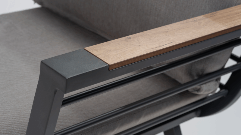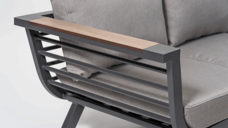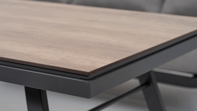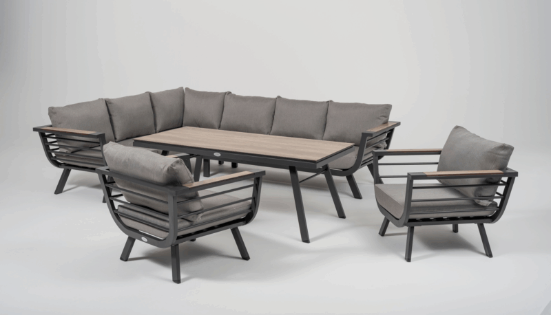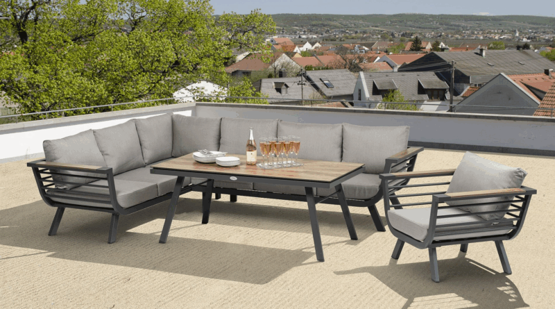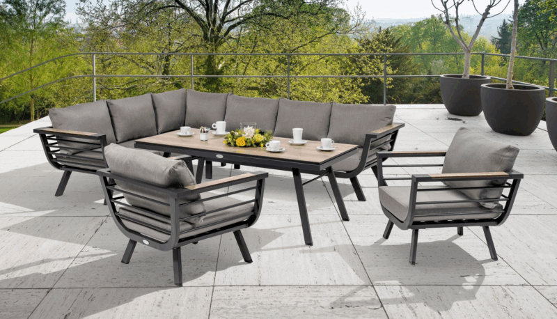 Moderná stolová súprava zo série Aruba krásne vynikne na záhradnej terase.