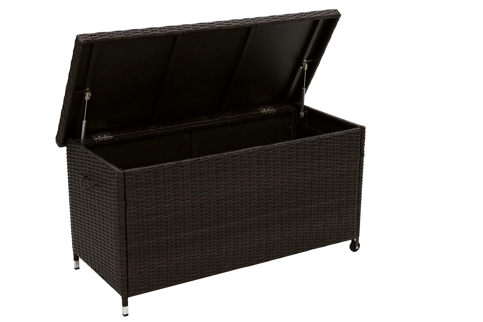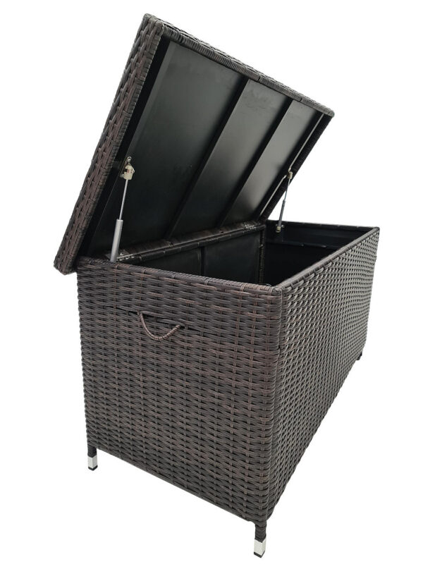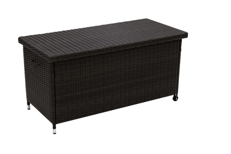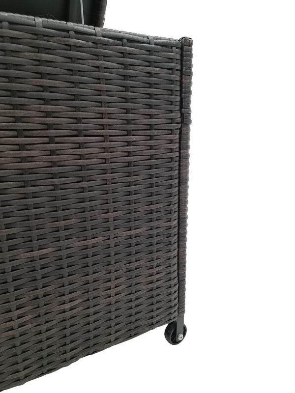 Praktický úložný box pre vankúše a nábytkové podušky. Vyrobené z umelého ratanu. Konštrukcia hliníková. Manipuláciu uľahčia 2 inštalované kolieska v spodnej časti konštrukcie. Najväčšou výhodou umelého ratanu je prakticky nulová schopnosť absorpcie tekutín, ktorá je hlavnou príčinou degradácie materiálu. Jedná sa o odolnejší variant prírodného materiálu. Umelý ratan je vyrábaný z polyetylénu, čo zaisťuje väčšiu pevnosť, stálofarebnosť a celkovú životnosť materiálu. Výhodou je ľahká údržba.