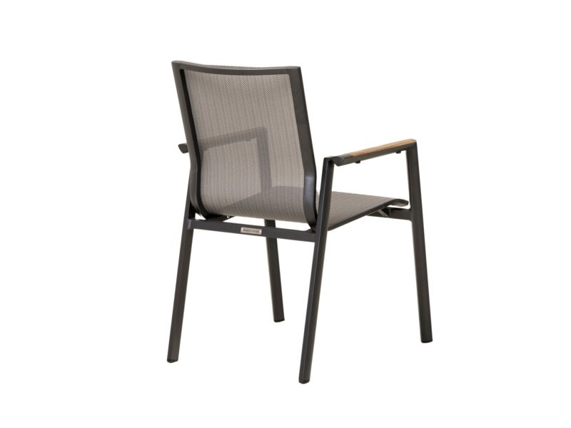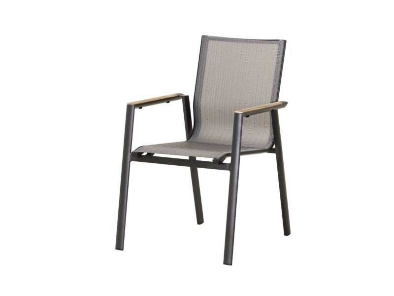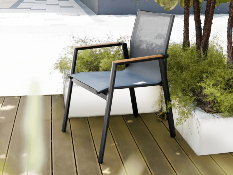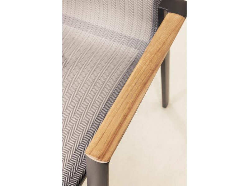 Vstúpte do sveta elegancie s Aspen jedálenskou stoličkou, ktorú hravo zladíte s jedálenským stolom. Jej antracitový hliníkový rám a teakové lakťové opierky dodávajú štýl, zatiaľ čo stohovateľný dizajn uľahčuje uskladnenie.