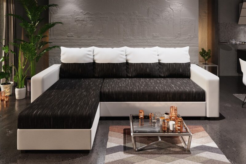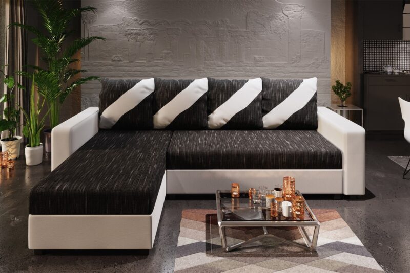 Moderná rozkladacia sedačka menších rozmerov ASTANIA L v poťahovom prevedení KORNET 10/DOLARO 511 v ľavom rohu má operadlo tvorené štyrmi dvojfarebnými vankúšmi, ktoré majú z jednej strany vodorovné pruhy a zo strany druhej šikmé pruhy. Môžete si tak otočením vankúšov meniť vzhľad sedačky. Každý vankúš má praktické zapínanie na zips.Poťahová látka KORNET je melírovaná poťahová látka, ktorá vzniká prepletením hrubých a tenkých nití v rôznych odtieňoch, tvorená sú zo 100% polyesteru. Vlákna sú výrazné, na dotyk mäkké a príjemné. Táto látka je odolná voči nečistotám a dostatočne pevná. Ekokoža DOLARO je látka, ktorá imituje prírodnú kožu. Je vyrobená zo zmesi syntetických látok. Koženka je na povrchu jemná a hladká. Je vystužená špeciálnou sieťovinou, ktorá bráni roztrhnutiu a zabezpečuje elasticitu.Prevedenie sedačky:Rám z masívneho dreva a drevotrieskyRozklad so spacou plochou 130×200 cmÚložný priestor s rozmermi 127x55x20 cmRozmery sedačky:šírka: 230 cmdĺžka: 146 cmvýška: 83 cmšírka sedadla: 132 cmšírka bokov: 16 cmdĺžka bokov: 78 cmcelková dĺžka otomanu: 146 cmvýška sedadla: 42 cmvýška bokov: 50 cmhĺbka sedadla s poduškami: 44 cmhĺbka sedadla bez podušiek: 70 cmhĺbka sedadla otomanu s poduškami: 119 cmhĺbka sedadla otomanu bez podušiek: 131 cmvýška nožičiek: 5 cmDodávame v demonte.Farebné prevedenie sa môže líšiť v závislosti od nastavenia Vášho monitora.