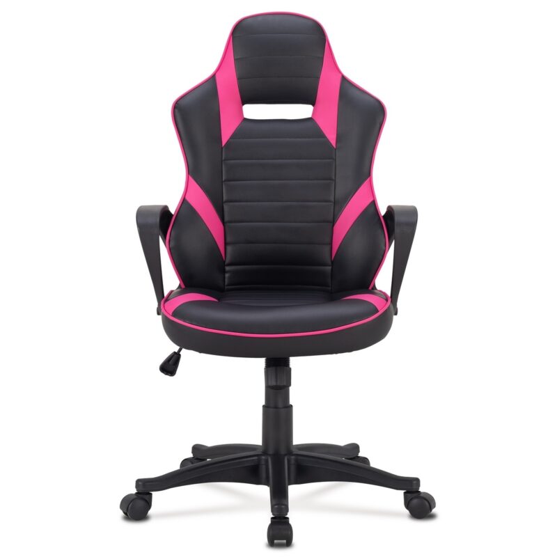 Elegantné a výrazne športové kancelárske kreslo v dizajne sedačky závodného vozidla a zaoblenými líniami. Má výborné ergonomické rozvrhnutie. Poťah je kombináciou čiernej a trendy ružovej ekokože. Kostra je z oceľových ohýbaných rúrok. Polstrovanie z kvalitnej PU peny je zárukou pohodlného posedenia počas herných večerov. Ruky si môžete pohodlne položiť na pevné plastové podrúčky.Kreslo je vybavené hojdacím mechanizmom. Sila hojdania sa reguluje plastovou skrutkou pod sedákom. Výška sedenia sa upravuje páčkou na pravej strane cez kvalitný plynový piest. Masívny čierny plastový kríž je osadený plastovými kolieskami na koberec.
