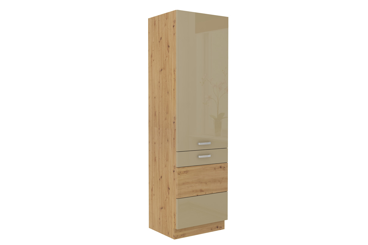 Nábytok AXEL je elegantný a výnimočný sektorový nábytok, ktorý je vhodný do nadčasových a moderných interiérov. V našej ponuke nájdete množstvo prvkov, z ktorých si zostavíte kuchyňu podľa vašich predstáv.Korpus skrinky je vyrobený z kvalitnej LTD dosky, ktorá sa jednoducho udržiava. Je vo farebnom prevedení dubu artisan. Dvierka sú vyrobené z MDF dosky potiahnuté PVC fóliou. Ich farebné prevedenie je v kombinácii farieb: capucino, dub artisan. Úchyty sú vyrobené z kovu. Sú v striebornej farbe.Kuchynská potravinová skrinka je vysoká, dvojdverová. Rozmery (š,v,h): 60 x 210 x 57 cm.Dodávame v demontovanom stave.