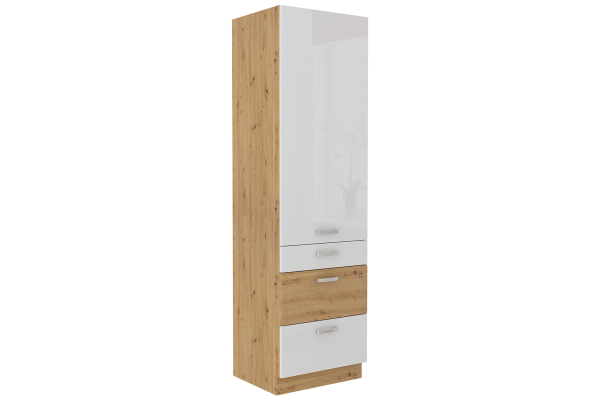 Nábytok AXEL je elegantný a výnimočný sektorový nábytok, ktorý je vhodný do nadčasových a moderných interiérov. V našej ponuke nájdete množstvo prvkov, z ktorých si zostavíte kuchyňu podľa vašich predstáv.Korpus skrinky je vyrobený z kvalitnej LTD dosky, ktorá sa jednoducho udržiava. Je vo farebnom prevedení dubu artisan. Dvierka sú vyrobené z MDF dosky potiahnuté PVC fóliou. Ich farebné prevedenie je v kombinácii farieb: biely lesk, dub artisan. Úchyty sú vyrobené z kovu. Sú v striebornej farbe.Kuchynská skrinka je vysoká, jednodverová. Má 3 praktické zásuvky. Rozmery (š,v,h): 60 x 210 x 57 cm.Dodávame v demontovanom stave.