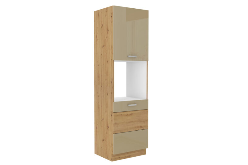 Nábytok AXEL je elegantný a výnimočný sektorový nábytok, ktorý je vhodný do nadčasových a moderných interiérov. V našej ponuke nájdete množstvo prvkov, z ktorých si zostavíte kuchyňu podľa vašich predstáv.Korpus skrinky je vyrobený z kvalitnej LTD dosky, ktorá sa jednoducho udržiava. Je vo farebnom prevedení dubu artisan. Dvierka sú vyrobené z MDF dosky potiahnuté PVC fóliou. Ich farebné prevedenie je v kombinácii farieb: capucino, dub artisan. Úchyty sú vyrobené z kovu. Sú v striebornej farbe.Kuchynská skrinka je vysoká, dvojdverová. V strede je priestor na vstavanú rúru. Rozmery (š,v,h): 60 x 210 x 57 cm.Dodávame v demontovanom stave.