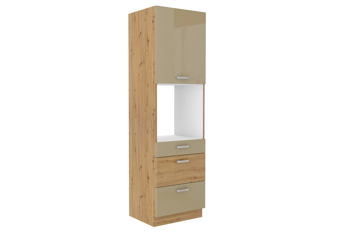 Nábytok AXEL je elegantný a výnimočný sektorový nábytok, ktorý je vhodný do nadčasových a moderných interiérov. V našej ponuke nájdete množstvo prvkov, z ktorých si zostavíte kuchyňu podľa vašich predstáv.Korpus skrinky je vyrobený z kvalitnej LTD dosky, ktorá sa jednoducho udržiava. Je vo farebnom prevedení dubu artisan. Dvierka sú vyrobené z MDF dosky potiahnuté PVC fóliou. Ich farebné prevedenie je v kombinácii farieb: capucino, dub artisan. Úchyty sú vyrobené z kovu. Sú v striebornej farbe.Kuchynská skrinka je vysoká, jednodverová. V strede je priestor na vstavanú rúru. Má 3 praktické zásuvky. Rozmery (š,v,h): 60 x 210 x 57 cm.Dodávame v demontovanom stave.
