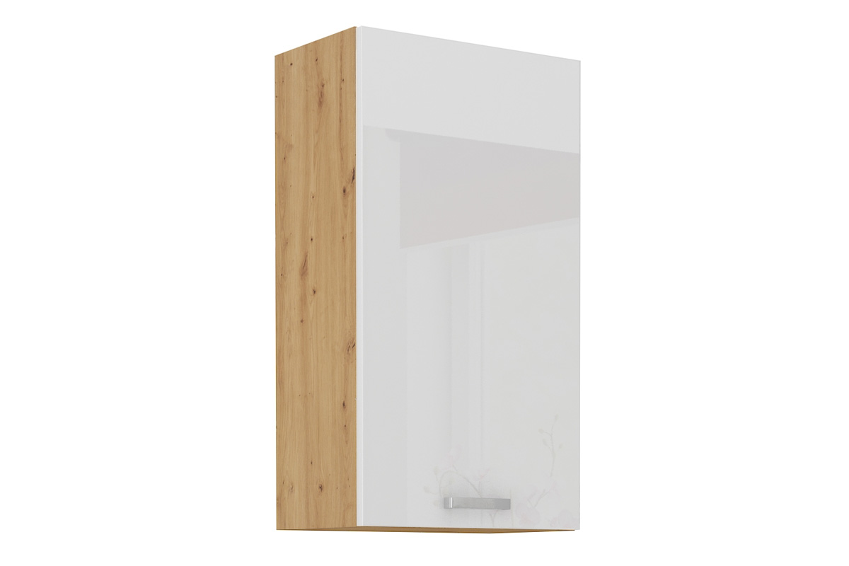 Nábytok AXEL je elegantný a výnimočný sektorový nábytok, ktorý je vhodný do nadčasových a moderných interiérov. V našej ponuke nájdete množstvo prvkov, z ktorých si zostavíte kuchyňu podľa vašich predstáv.Korpus skrinky je vyrobený z kvalitnej LTD dosky, ktorá sa jednoducho udržiava. Je vo farebnom prevedení dubu artisan.Vo vnútri sa nachádzajú 3 police. Dvierka sú vyrobené z MDF dosky potiahnuté PVC fóliou. Ich farebné prevedenie je v kombinácii farieb: biely lesk, dub artisan. Úchyty sú vyrobené z kovu. Sú v striebornej farbe.Horná kuchynská skrinka je jednodverová. Rozmery (š,v,h): 45 x 90 x 31 cm.Dodávame v demontovanom stave.