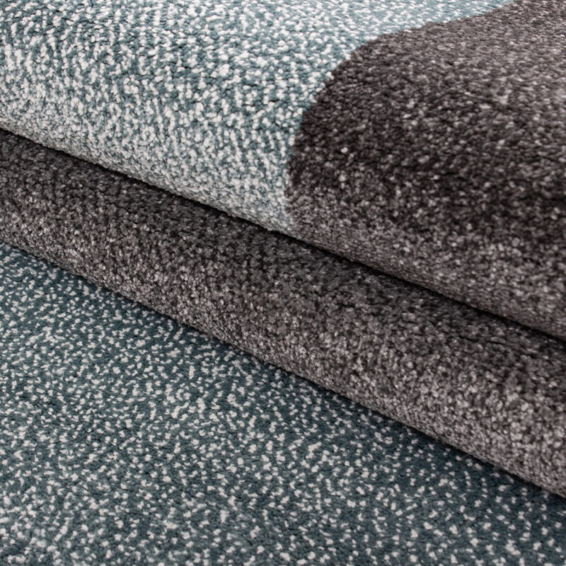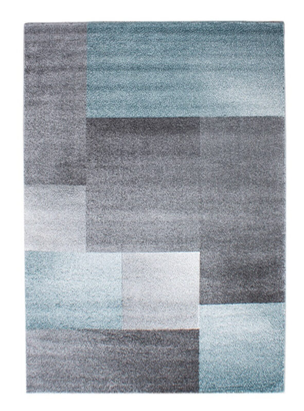 Modrošedý kusový koberec Lucca 1810 blue s peknými geometrickými vzormi je vyrobený z kvalitného 100% polypropylénu frisé