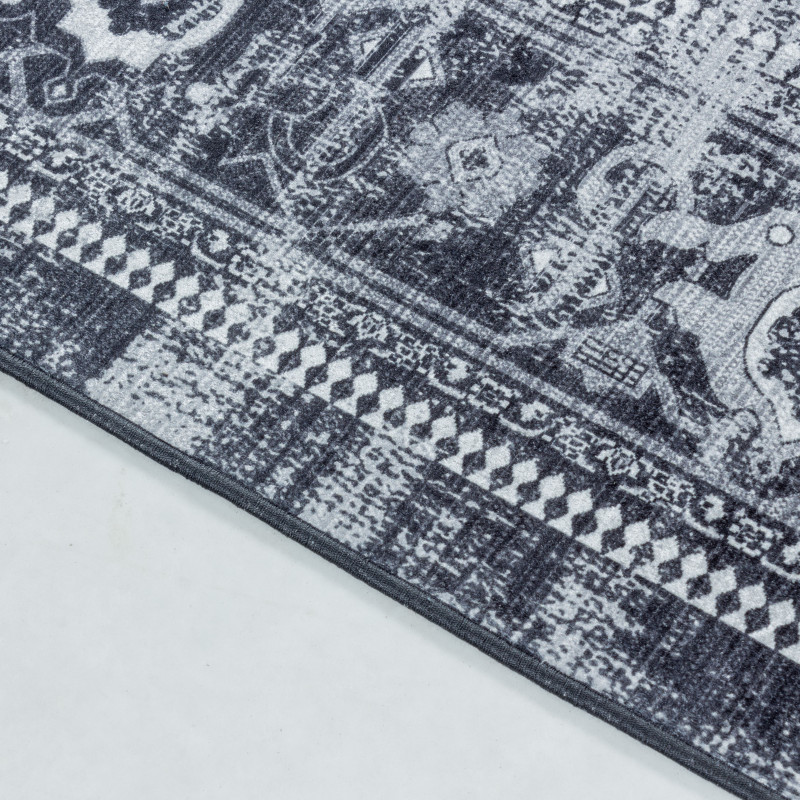 Čierno-sivý koberec vo vintage orientálnom štýle sa vďaka svojej neutrálnej farbe hodí do každej domácnosti. Vyrába sa zo 100% polyesteru, takže je veľmi príjemný na dotyk. Ďalšou výhodou je ľahká údržba – stačí použiť vysávač a prípadné škvrny utrieť mokrou handričkou.