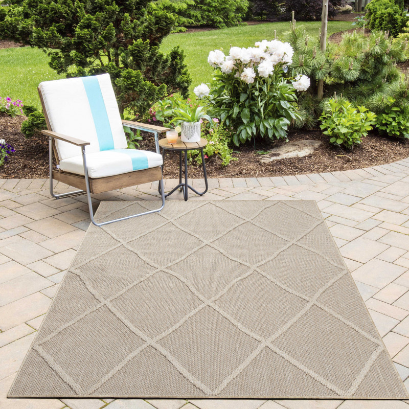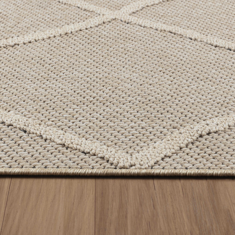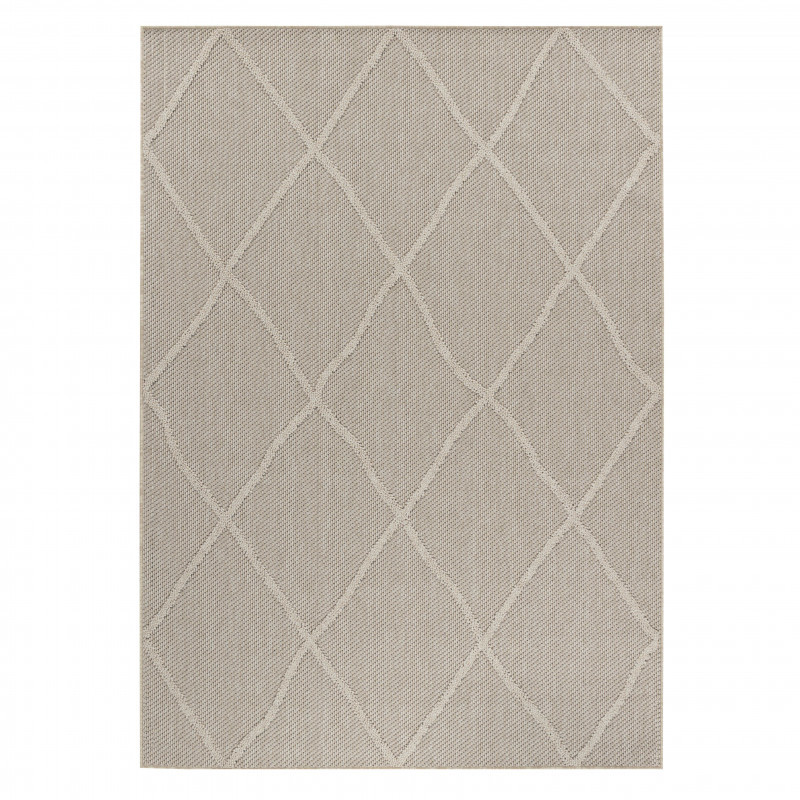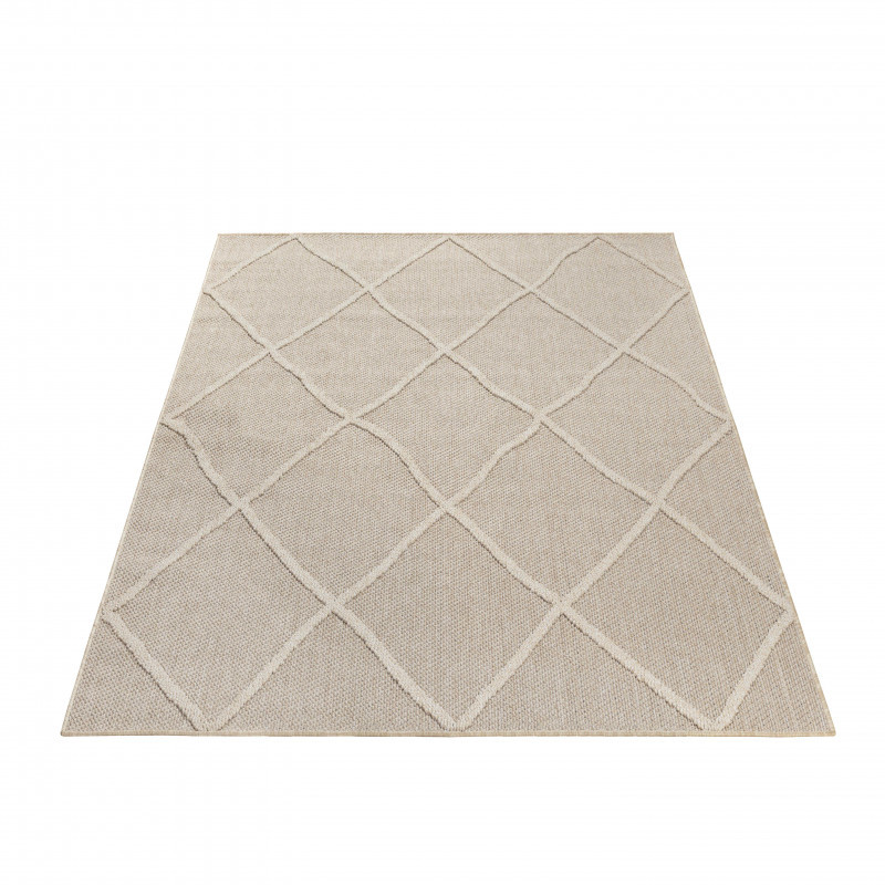 Béžový koberec, ktorý kombinuje veľmi krátke slučky s vyšším vlasom, čo vytvára zaujímavý 3D efekt. Nepravidelné vystupujúce kosoštvorce dodajú šmrnc každej domácnosti, pričom koberec môžete položiť do chodby, obývačky, ale aj von na terasu alebo balkón.