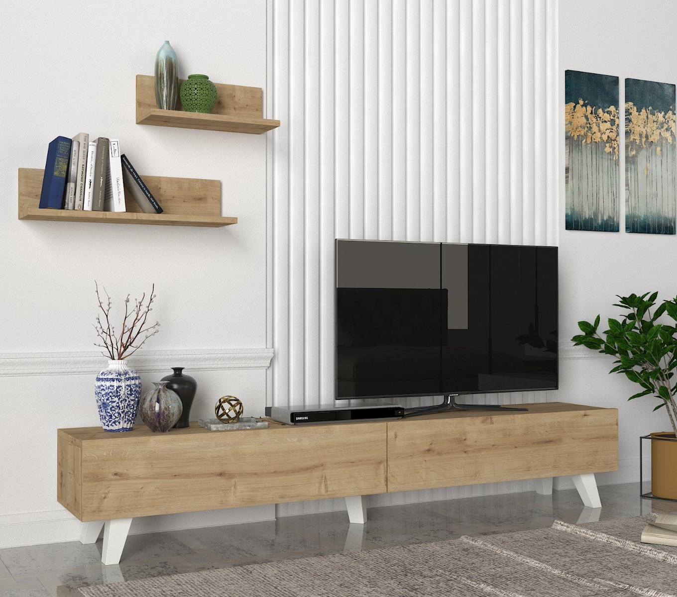 Štýlový TV stolík na nožičkách AZIA vás očarí svojim minimalistickým dizajnom a priaznivou cenou. Tento nábytok je charakteristický prírodnou kresbou dreva, ktorá je doplnená bielymi modernými nožičkami. TV skrinka poskytuje dostatok úložného priestoru vo forme skriniek s výklopom. Bonusom sú závesné police v cene, ktoré ideálne poslúžia na vystavenie dekorácií či kníh. Farebné prevedenie: sapphireRozmery TV stolíka: (š/v/h) 180 x 32,6 x 31,3 cm (ďalšie rozmery v nákrese)Dodávame v demonte.