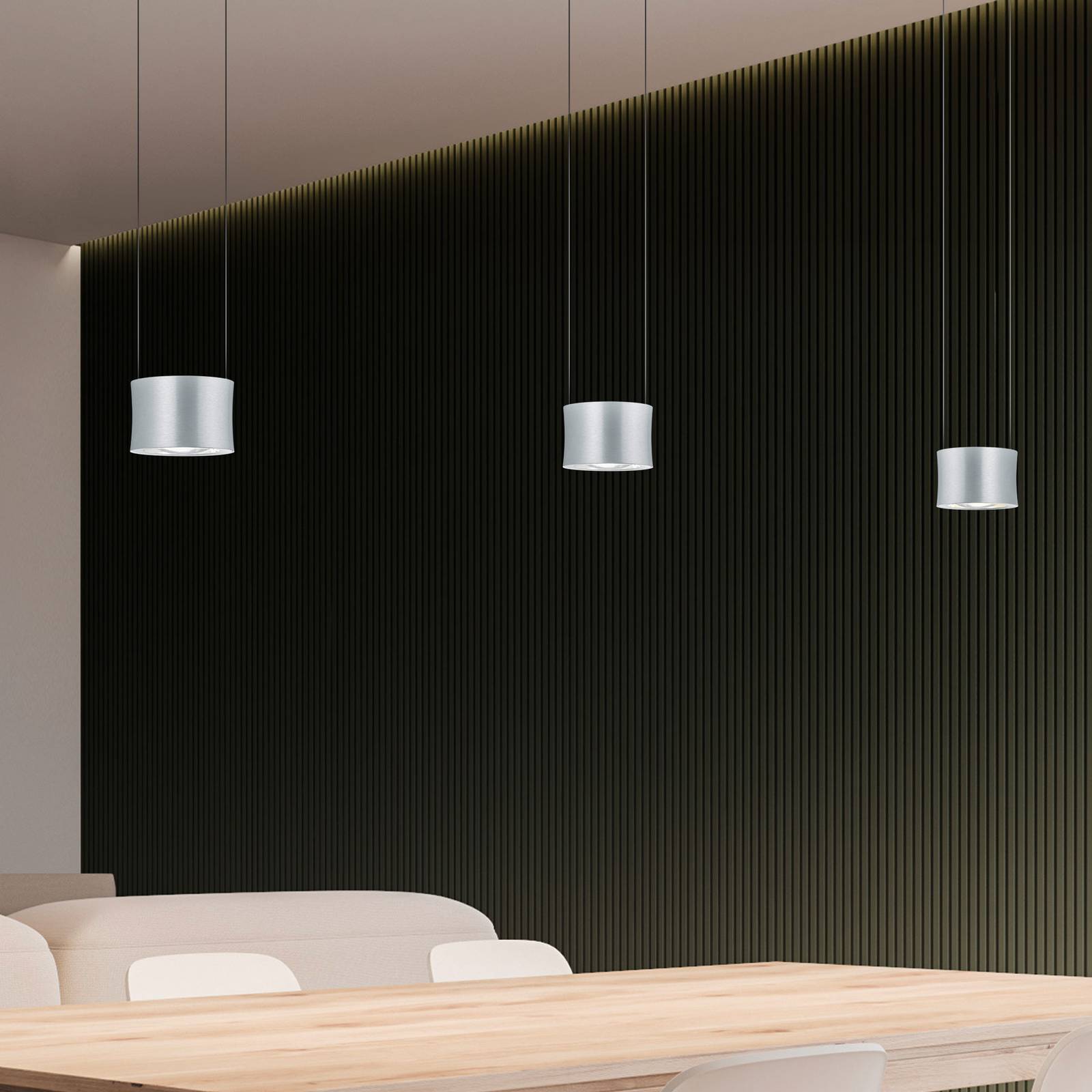 Trojlampa Impulse LED v matnom nikli s chrómovými detailmiVysokokvalitná závesná lampa Impulse od nemeckého výrobcu BANKAMP sa používa na priame a nepriame osvetlenie v moderných interiéroch. Tri valcové svetelné prvky vyrobené z hliníka visia z dlhého vrchlíka zo železa. Teplé biele svetlo integrovaných LED diód svieti smerom nadol a nahor cez priehľadné sklenené kryty. Zobrazuje predmety v miestnosti v ich prirodzených farbách a jeho jas možno regulovať pomocou externých stmievačov s vypínaním fázy. Počas inštalácie je výška zavesenia individuálne nastaviteľná od 90 do 150 cm.