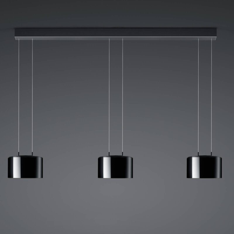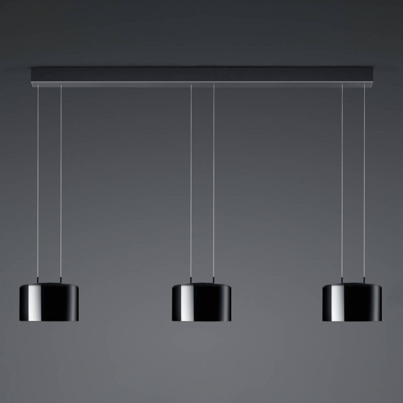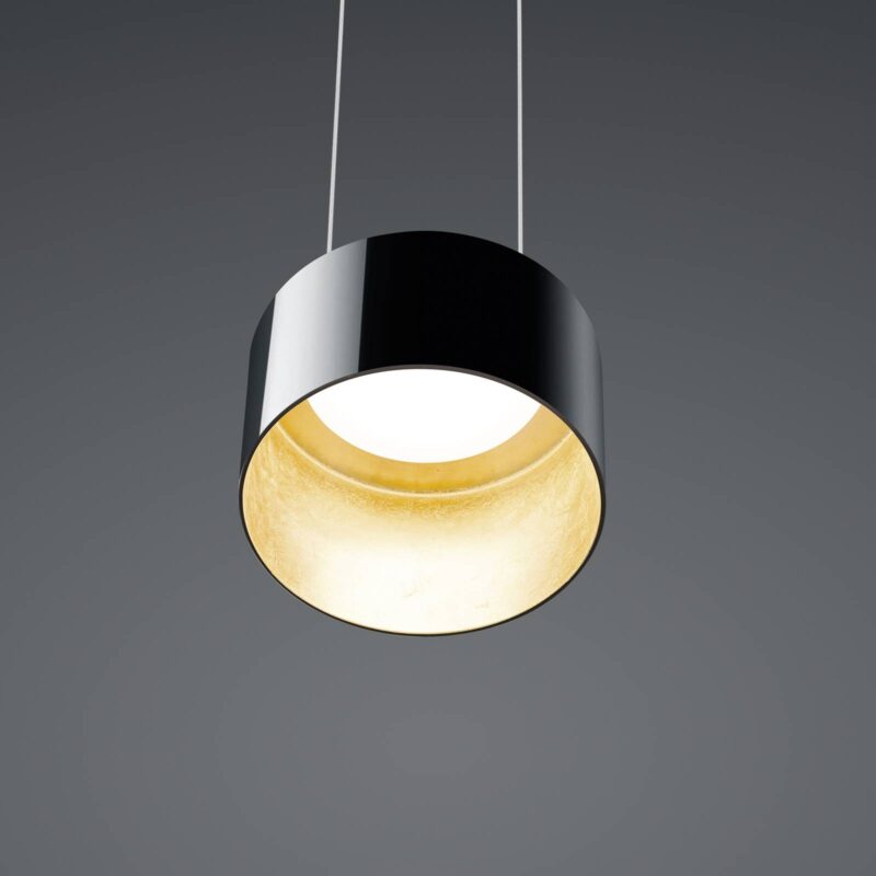 Trojlampa Luce elevata Grand LED závesná lampa s funkciou vertikálneho stmievania Trojlampa Luce elevata Grand LED závesná lampa v čierno-zlatej farbe je veľmi moderná nielen vizuálne, ale aj z hľadiska svetelnej techniky. Inštalovaná je funkcia stmievania na teplé (zníženie teploty farieb) aj funkcia vertikálneho stmievania (ovládanie svetelných funkcií miernym naklonením telesa svietidla). Proces stmievania sa začína pri uhle 12 stupňov. Luce elevata Grand možno zapínať a vypínať aj prostredníctvom funkcie vertikálneho stmievania. Pozor: Nesmie sa však pripojiť žiadny externý stmievač. Vzhľad zlatých listov na vnútornej strane tienidla dodáva vyžarovanému svetlu dodatočnú teplú žiaru. – výškovo nastaviteľné
