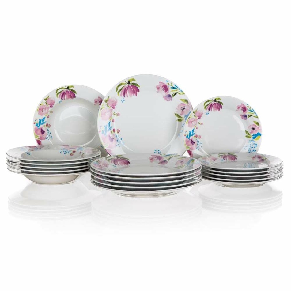 Porcelánová jedálenská súprava s kvetinovým vzorom v jemných pastelových odtieňoch vás vždy príjemne naladí. Kvetinové motívy sú teraz veľmi obľúbené a módne. Súprava je vhodná pre každodenné používanie, umývanie v umývačke riadu i ohrievanie v mikrovlnnej rúre.Porcelán zaistí riadu pevnosť, lesk a krásne hladký povrch. Pre umývanie v umývačke odporúčame používať iba šetrné umývacie programy, dekor je na glazúre.Sada obsahuje: