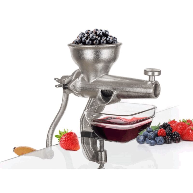 Liatinový odšťavovací mlynček na ovocie Banquet je ideálny pre spracovanie drobného ovocia (malín, černíc, ríbezlí, jahôd), z ktorého pripravíte výborné domáce šťavy a marmelády. Odšťavovací šnek vo vnútri strojčeka automaticky oddeľuje u ovocia šťavu od šupiek s jadierkami a je vybavený skrutkou pre nastavenie sily odšťavovania. Výsledná šťava si zachováva všetky hodnotné látky vrátane enzýmov.Materiál držadla: liatina / drevo