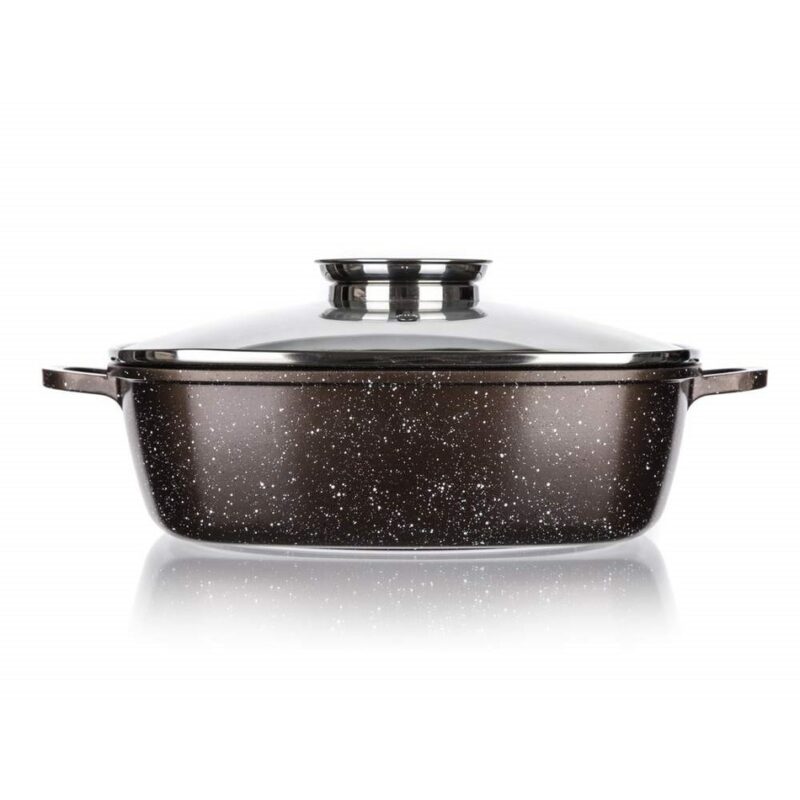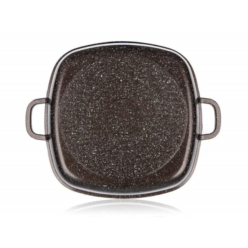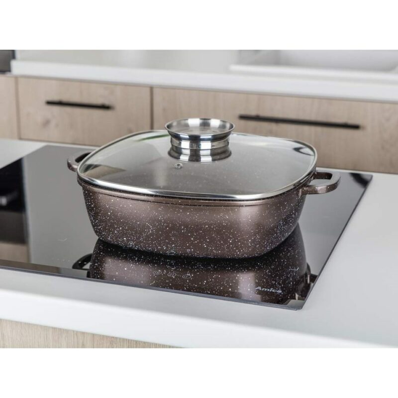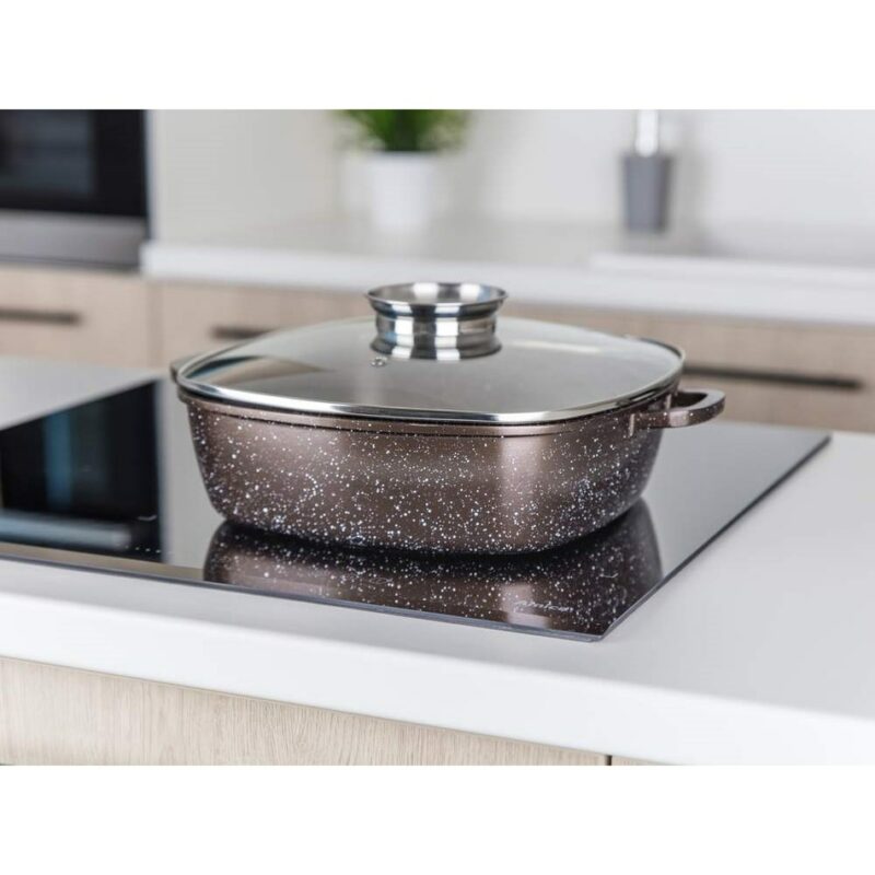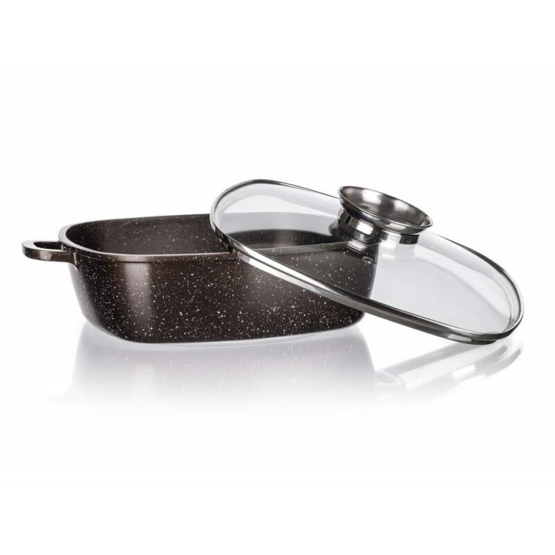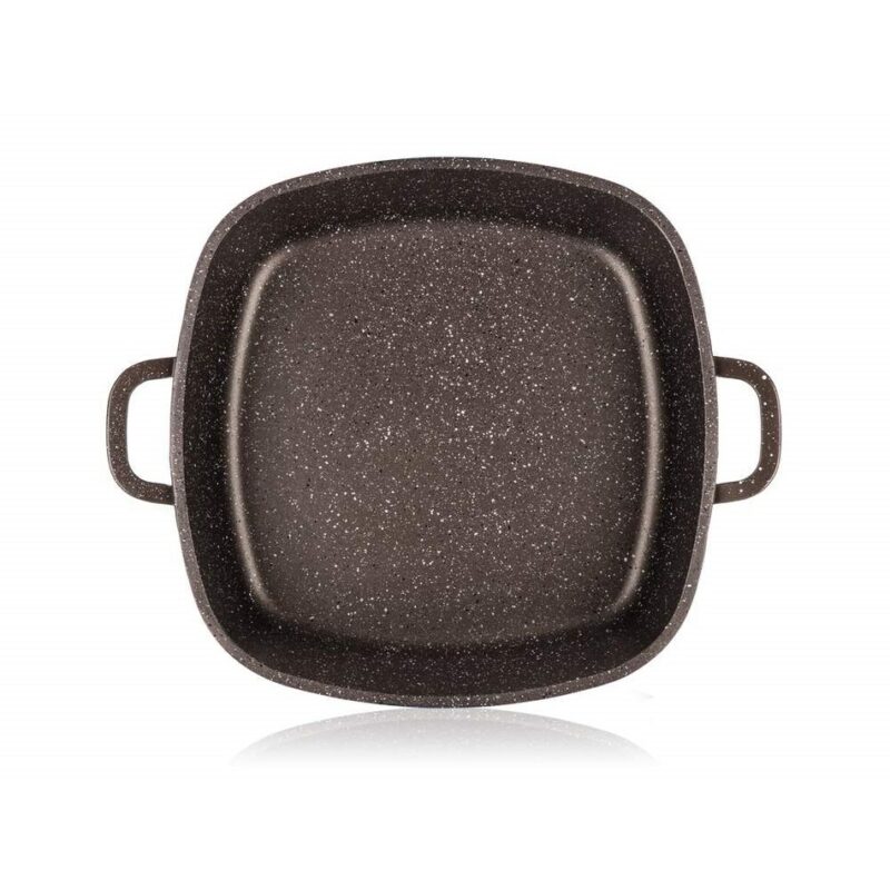 Liaty hliníkový pekáč Premium Dark Brown s rozmerom 28 x 28 x 8 cm so sklenenou pokrievkou s aróma knobom, má 2-vrstvový vnútorný nepriľnavý povrch v mramorovej štruktúre Dark Brown. Pekáč je opatrený vonkajším žiaruvzdorným nástrekom v mramorovej štruktúre, vrátane indukčného dna, ktoré je tiež kryté žiaruvzdorným nástrekom. Hrúbka dna: 4,5 mm, hrúbka steny: 2 mm.