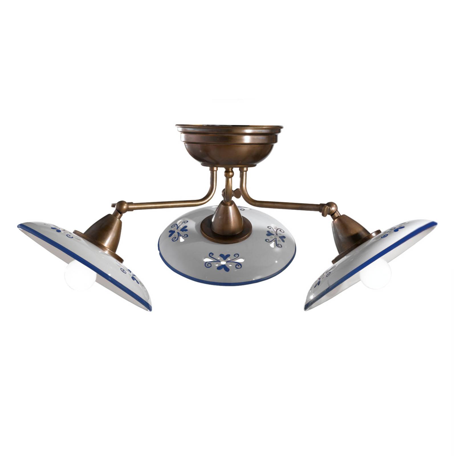 Trojsvetelné stropné svietidlo Bassano s krásnym keramickým tienidlomTrojsvetelné stropné svietidlo Bassano je svetelný produkt prvotriednej kvality a spracovania, ručne vyrobený v Taliansku. Keramické tienidlá Bassano boli ručne maľované. Strop a ramená lampy sú vyrobené z mosadze a boli opatrené lešteným povrchom, ktorý umocňuje vidiecky štýl lampy. Každé z troch tienidiel sa dá nastaviť v sklone a zafixovať v požadovanej polohe pomocou kĺbu s poistnou skrutkou, takže stropnou lampou možno dokonale osvetliť aj veľké miestnosti. Ako svietidlá možno použiť bežné žiarovky s príkonom do 100 W, ale aj úsporné žiarovky a – mimoriadne účinné a dlhotrvajúce – moderné LED žiarovky. Obzvlášť krásne vyzerá stropné osvetlenie aj s guľovými žiarovkami.