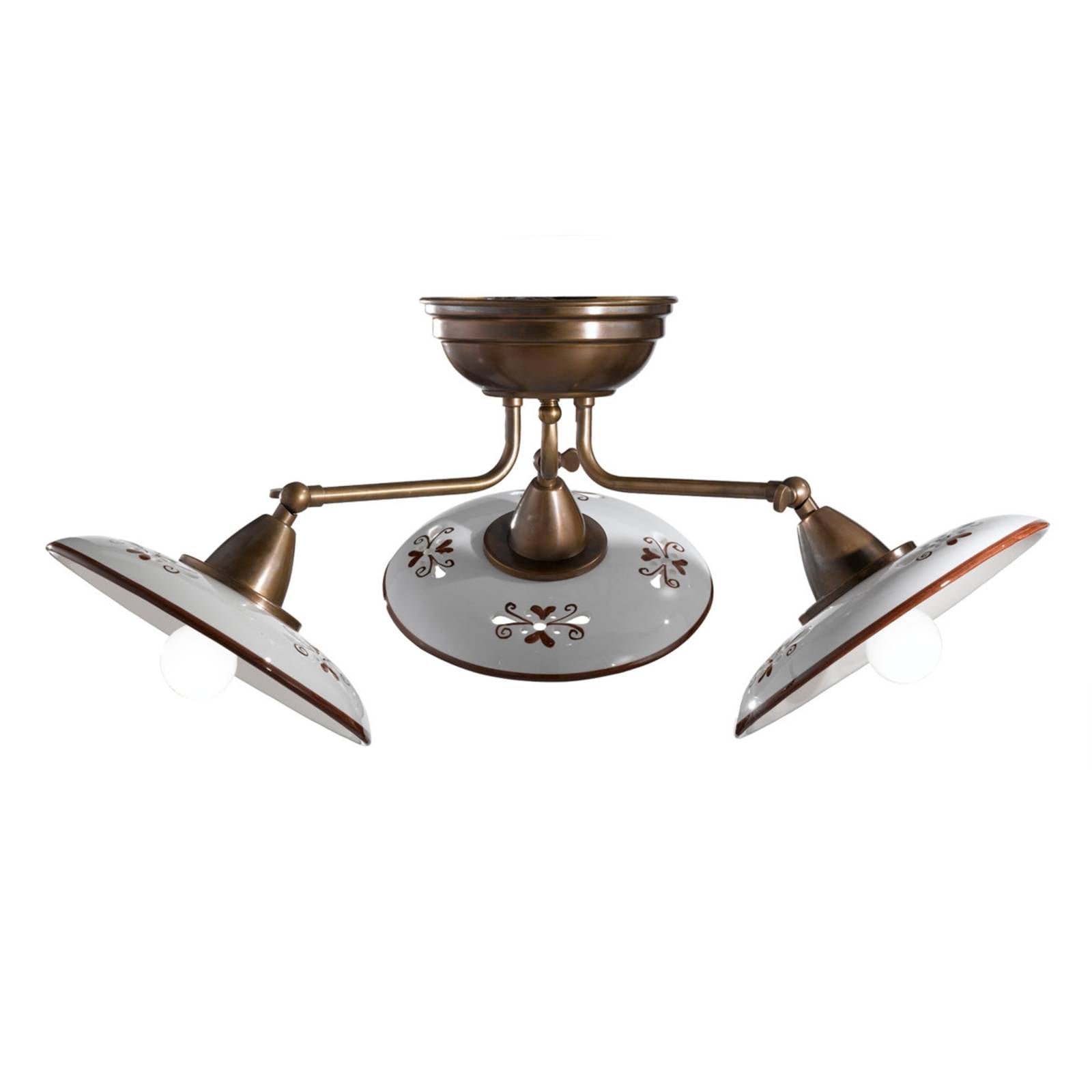 Trojsvetelné stropné svietidlo Bassano s krásnym keramickým tienidlomTrojsvetelné stropné svietidlo Bassano je svetelný produkt prvotriednej kvality a spracovania, ručne vyrobený v Taliansku. Keramické tienidlá Bassano boli ručne maľované. Strop a ramená lampy sú vyrobené z mosadze a boli opatrené lešteným povrchom, ktorý umocňuje vidiecky štýl lampy. Každé z troch tienidiel sa dá nastaviť v sklone a zafixovať v požadovanej polohe pomocou kĺbu s poistnou skrutkou, takže stropnou lampou možno dokonale osvetliť aj veľké miestnosti. Ako svietidlá možno použiť bežné žiarovky s príkonom do 100 W, ale aj úsporné žiarovky a – mimoriadne účinné a dlhotrvajúce – moderné LED žiarovky. Obzvlášť krásne vyzerá stropné osvetlenie aj s guľovými žiarovkami.