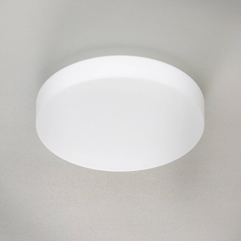 Okrúhle stropné svietidlo LED v bielom plášti Či už na schodisku, na chodbe alebo dokonca v kúpeľni – stropné svietidlo LED s krytím IP44 presvedčí homogénnym, neoslňujúcim svetlom, ktoré je vďaka teplým bielym LED diódam vnímané ako mimoriadne príjemné. Vďaka jasnému tvaru a jemným prechodom pôsobí nenápadne a sústreďuje sa na žiarivé svetlo. Stropné svietidlo sa dodáva s napájacou jednotkou LED s riadením DALI a môže sa používať aj ako nástenné svietidlo. Montáž svietidla je veľmi jednoduchá vďaka dvom montážnym otvorom. Kryt svietidla je vyrobený z kovu, zatiaľ čo difúzor je z fúkaného skla. – Ovládanie pomocou DALI – Vhodné na priechodné zapojenie – vysoký index podania farieb Ra > 90