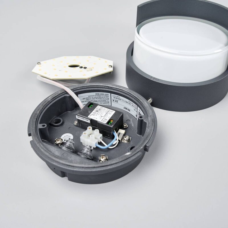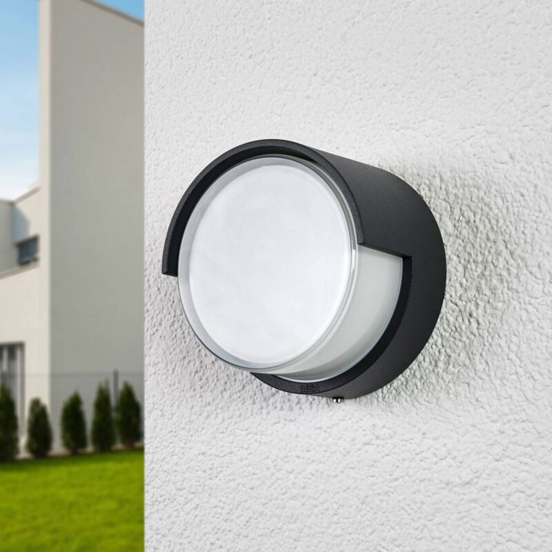 Okrúhle exteriérové nástenné LED svietidlo odolné proti nárazom 33507K3 s LED diódami s teplým bielym svetlom – IP65 Robustné, trvácne, nadčasové a moderné – týmito všetkými atribútmi sa vyznačuje exteriérové nástenné LED svietidlo 33507K3. V ráme z hliníkovej liatiny grafitovej farby sa nachádza okrúhle tienidlo z hrubého krištáľového skla s bielym vnútrom. Teplé biele LED diódy, ktoré sú zabudované vnútri tienidla, svietia homogénne cez biele sklo, pričom svetlo je z hornej strany zaclonené. Či už v skupine alebo osamote, exteriérové nástenné LED svietidlo dokáže splniť najrozličnejšie úlohy týkajúce sa osvetlenia a vďaka stupňu ochrany IP65 odolá akýmkoľvek poveternostným podmienkam. Svietidlá sa pripevňujú pomocou bajonetových spojok, teda bez viditeľných skrutkových spojov. Iba rám z hliníkovej liatiny je upevnený jednou zaisťovacou skrutkou. Kvalitné svietidlá, ktoré sa vyznačujú prvotriednym spracovaním a najlepšími materiálmi – to sú produkty výrobcu svietidiel BEGA, ktorý už takmer 70 rokov vyrába svietidlá pre najrozličnejšie oblasti architektúry a ktorý už od svojich počiatkov kladie mimoriadny dôraz na trvalú udržateľnosť a šetrné zaobchádzanie so zdrojmi.
