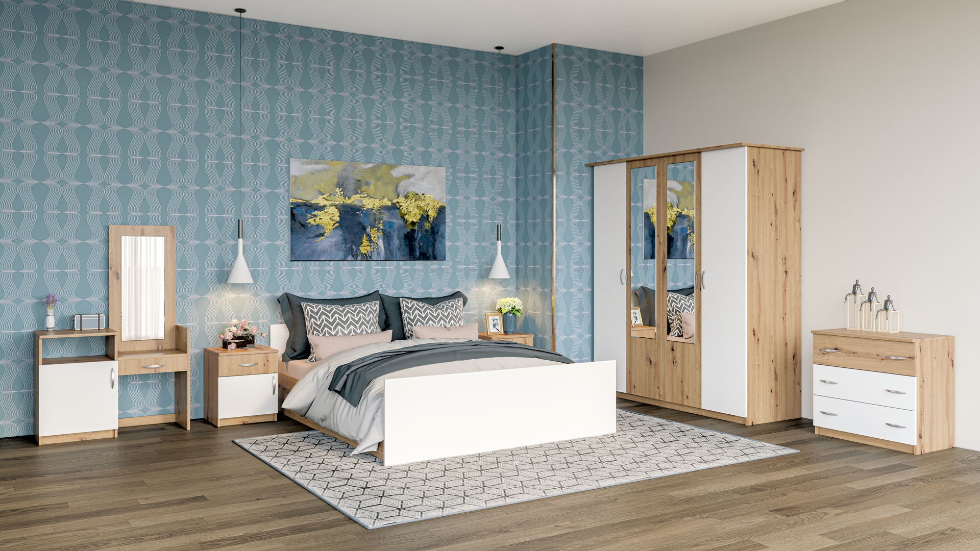 Nábytok do spálne BEKIM predstavuje systémovú kolekciu, ktorá umožní komfortné vybavenie spálne. Vysoká funkčnosť jednotlivých súčastí a atraktívny design sú zárukou zákazníkovej spokojnosti.Jednotlivé súčasti tejto kolekcie sa môžu pochváliť vysokou kvalitou prevedenia, precíznym dokončením a v neposlednom rade dôrazom na každý detail.Spálňový komplet BEKIM je vyrobený v elegantnom klasickom štýle, pre ktorý je charakteristické prírodné farebné prevedenie a vyvážené dekoratívne prvky.Zostava BEKIM obsahuje:Posteľ 160 s roštom : 1700*670*2060 mmŠatníková skriňa : 1700*1990*590 mmKomoda: 730*705*430 mm2 ks nočný stolík: 425*520*405 mmToaletný stolík: 930*1415*410 mmRošt je v cene. Matrac je potrebné dokúpiť. (160 x 200)Farebné prevedenie: dub Artisan / biela matnáNábytok dodávame v demonte s návodom na montáž.