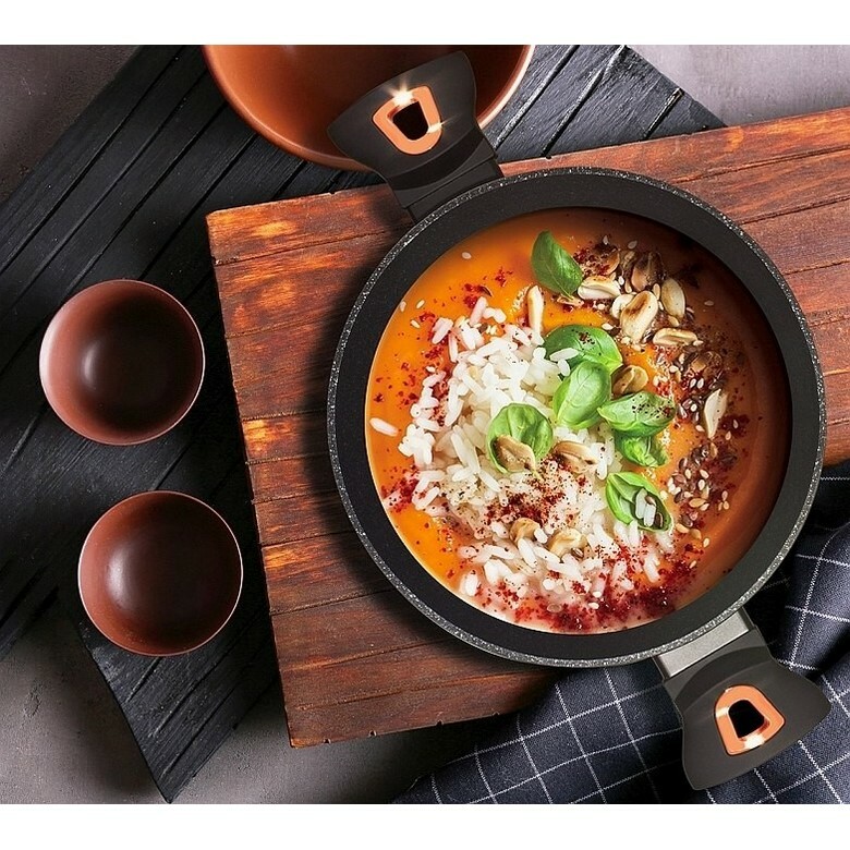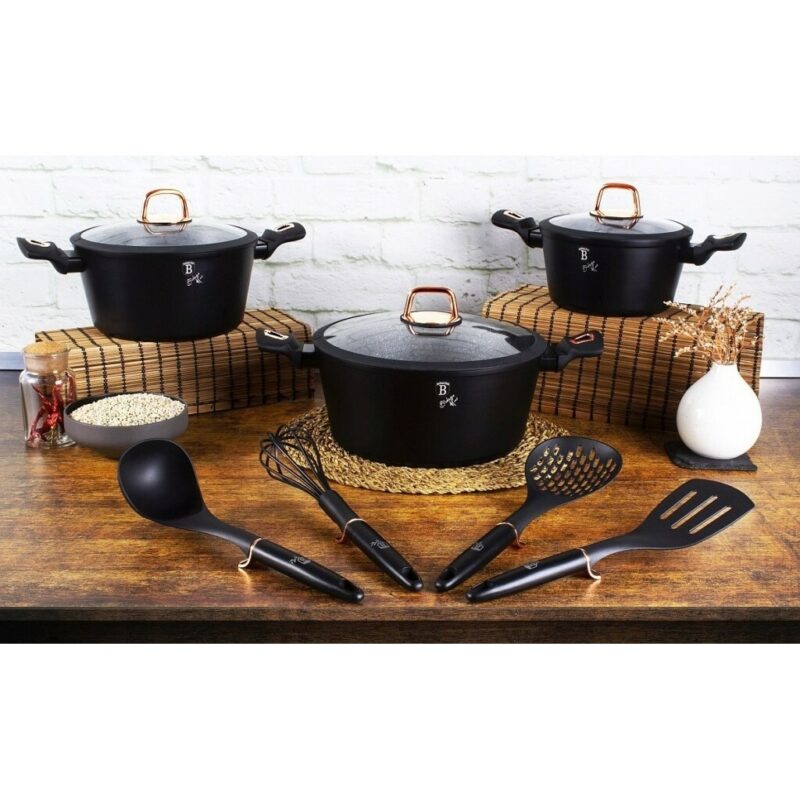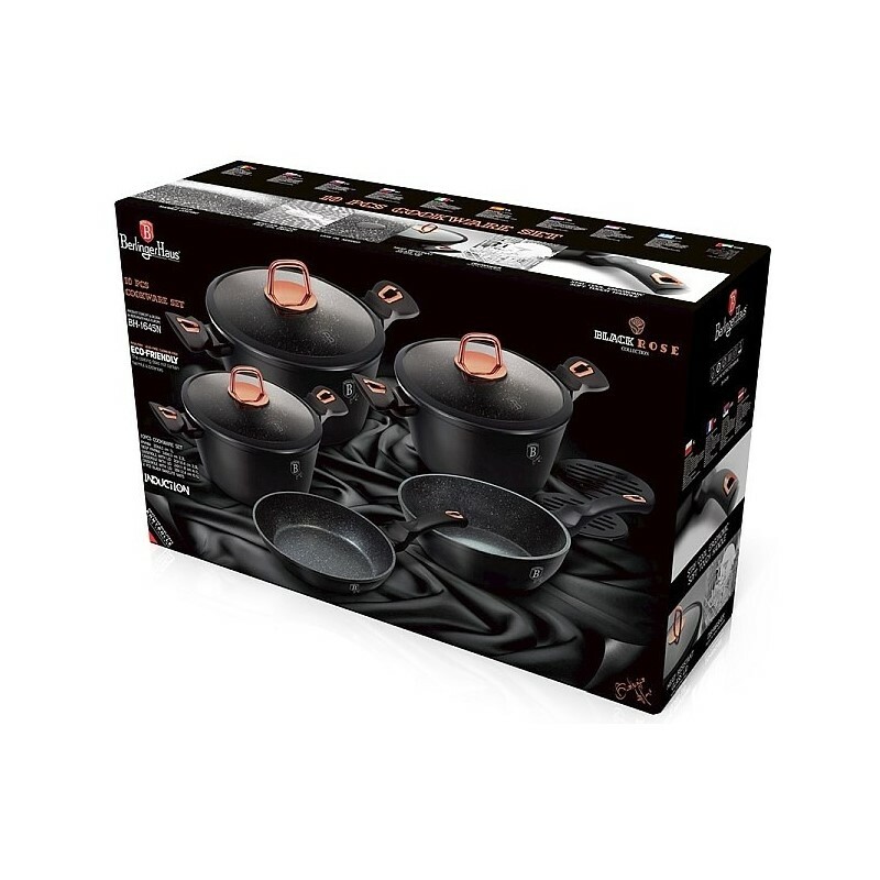 Luxusná a moderná sada riadu z kolekcie Black Rose Collection, vyrobená z vysoko odolného kovaného hliníka, si nájde svoje miesto v každej kuchyni. Riad je opatrený 3-vrstvovým nepriľnavým mramorovým povrchom pre varenie s minimom tuku. Je odolný voči nárazu a deformácii tvaru. Riad má ergonomické mäkčené rukoväte a bočné úchyty, ktoré zostávajú vždy chladné. Je doplnený pokrievkami z tvrdeného žiaruvzdorného skla s nerezovým úchopom a parným otvorom. TURBO indukčné dno rovnomerne rozvádza teplo a umožňuje úsporu energie až 35 %. Ecofriendly, neobsahuje olovo, kadmium, PFOA.Vhodné k zapekaniu v rúre aj s pokrievkou do maximálnej teploty 160 °C.Sada obsahuje: