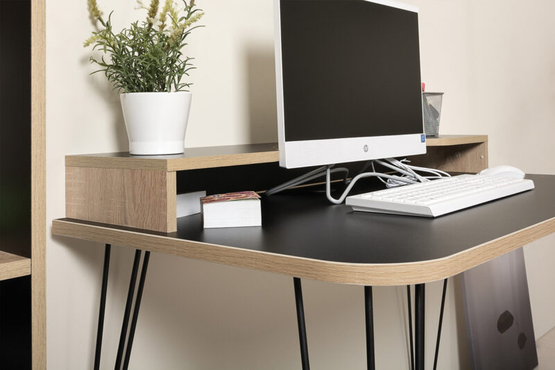 Písací stôl BERNIE patrí medzi menšie písacie stoly. Napriek tomu je to praktický nábytok, ktorý ponúka viacero zaujímavostí. Nadstavba nad stolom vytvára praktický priestor pre položenie monitora či rôznych predmetov, kníh a písomností. Súčasne zabráni pádu predmetov za stôl. Štýlové nohy stola dodávajú nábytku šmrnc. Nábytok je vyrobený z kvalitnej LTD dosky, ktorej údržba nie je náročná. Farebné prevedenie je v kombinácii farieb čierna a dub sonoma. Kontrastné farby dodávajú zaujímavý vzhľad a zvýrazňujú celkový dizajn. Oceníte aj efektné zaoblenie hrán stola, ktoré zvýši bezpečnosť.Rozmery stola (š/v/h): 110/84/60 cm. Dodávame v demonte.Tento unikátny kus nábytku je ideálny do detskej izby aj pracovne a vďaka jeho kvalitám si ho určite obľúbite. V našej ponuke nájdete aj ďalšie prvky nábytku BERNIE.