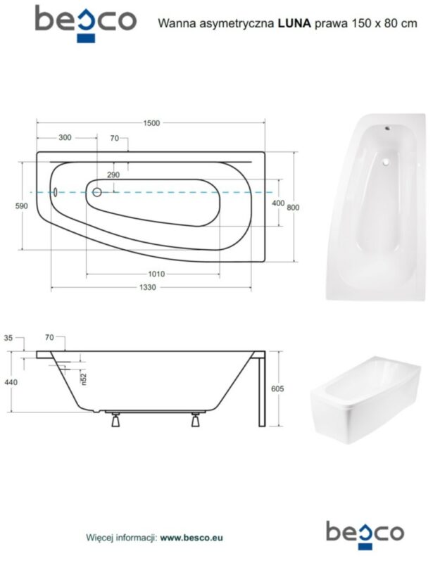 BESCO – Asymetrická vaňa LUNA – Nožičky k vani – S nožičkami, Rozmer vane – 150 × 80 cm, Spôsob prevedenia – Pravé VANLUN150P + OLVPINOZ