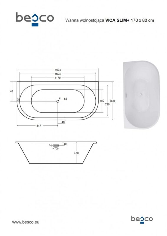 BESCO – Asymetrická vaňa VICA SLIM+ biela, sifón so štrbinovým prepadom – Farba sifónu – Biela, Nožičky k vani – S nožičkami, Rozmer vane – 170 × 80 cm VANVIC170SLIMW+OLVPINOZ