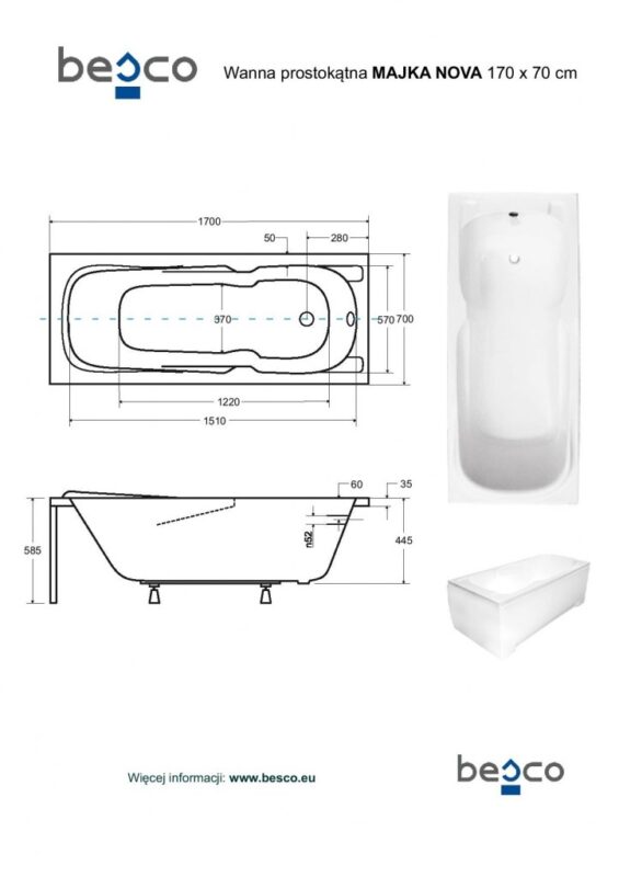 BESCO – Obdĺžniková vaňa MAJKA NOVA – Nožičky k vani – S nožičkami, Rozmer vane – 170 × 70 cm VANMAJN170+OLVPINOZ