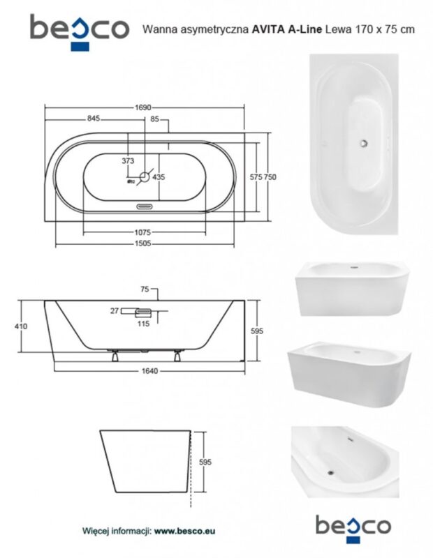 Asymetrická voľne stojaca vaňa AVITA A-LINE v populárnej čierno/bielej kombinácii farieb , ktorá je určená pre inštaláciu do rohu k stene a ponúkame ju v dvoch praktických rozmeroch , vaňa má robustnú konštrukciu a jemný moderný dizajn . Vaňa je vyrobená z kvalitného sanitárneho akrylátu . Vďaka tomu má praktickú hmotnosť a je dostatočne pevná . Výhodou je jednoduchá inštalácia, nie je nutné podmurovanie ani obklad vane . Súčasťou vane je aj odtokový systém click-clack so štrbinovým prepadom vo farbe chróm . Ďalej ponúkame tieto sifóny za príplatok v ďalších 4 farbách (zlatá, čierna, biela a grafitová ). Vaňa v ľavom/pravom prevedení na montáž do rohu AVITA A-LINE v čierno/bielej kombinácii farieb sa Vám odmení pocitom vysokého komfortu . Budete ležať v kúpeli a okolo Vás bude dosť miesta, nič Vás nebude obmedzovať. Vaňa aj vonkajší plášť tvoria kompaktný celok . Vaňa sa štandardne dodáva v dvoch praktických rozmeroch v žiarivo bielej farbe vo vnútri vane a modernej čiernej farbe z vonku . Hladký povrch umožňuje jeho ľahkú údržbu. Vaňu netreba obmurovať a obkladať a súčasťou vane je aj kvalitná odtoková súprava (systém so štrbinovým prepadom ). Rozmer voľne stojacej vane: 150 × 75 cm, objem 200 l 170 × 75 cm, objem 250 l Materiál: Sanitárny akrylát Farebné prevedenie vane: Čierna lesklá (vonkajšia strana vane) / biela lesklá farba (vnútorná časť vane) Súčasťou vane je aj click-clack sifón so slim oválnym krytom prepadu a ten si môžete vybrať z týchto farieb: chróm (štandard) zlatá farba (za príplatok) čierna farba (za príplatok) biela farba (za príplatok) grafitová farba (za príplatok) ZÁRUKA 10 rokov(GT)