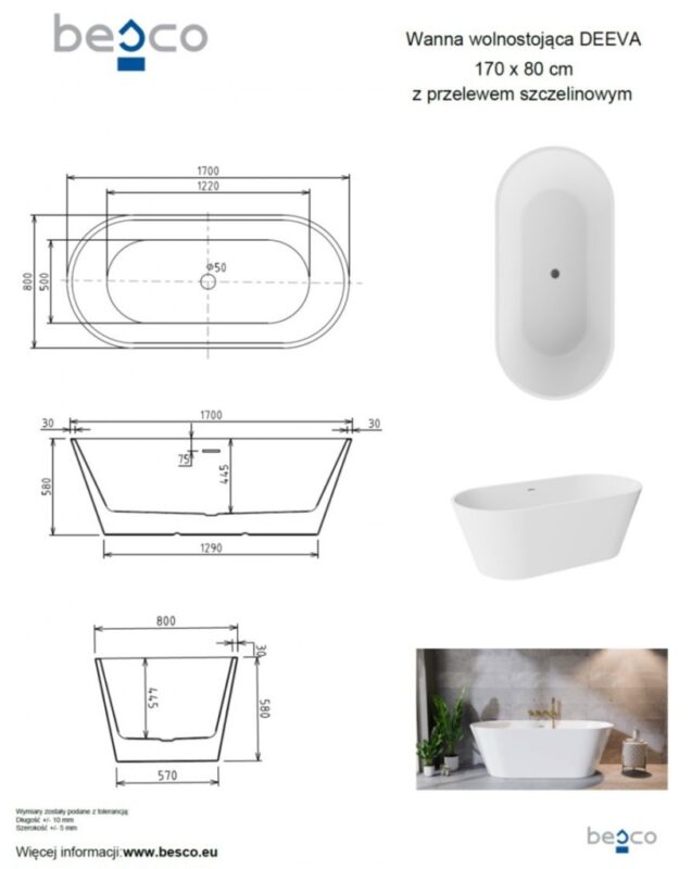 BESCO – Voľne stojaca vaňa DEEVA biela – Farba – Biela, Farba sifónu – Chróm, Rozmer vane – 170 × 80 cm VANDEEVA170C