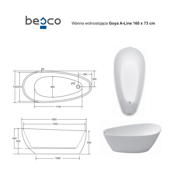 BESCO – Voľne stojaca vaňa GOYA A-LINE biela – Farba – Biela, Farba sifónu – Čierna, Rozmer vane – 160 x 73 cm VANGOYAA160B
