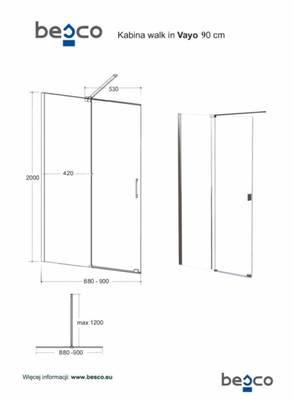 BESCO – Walk-in sprchovací kút VAYO – FARBA rámu – Chróm / Leštený hliník (ALU), Rozmer A – 90, Rozmer C – 200, Smer zatvárania – Univerzálne Ľavé / Pravé, Výplň – Číre bezpečnostné sklo – 8 mm BCVAYO90CC