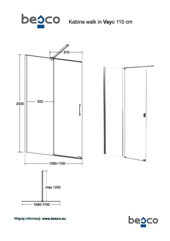 BESCO – Walk-in sprchovací kút VAYO – Farba rámu zásteny – Hliník chróm, Rozmer A – 110, Rozmer C – 200, Smer zatváranie – Univerzálny Ľavé / Pravé, Výplň – Číre bezpečnostné sklo – 8 mm BCVAYO110CC