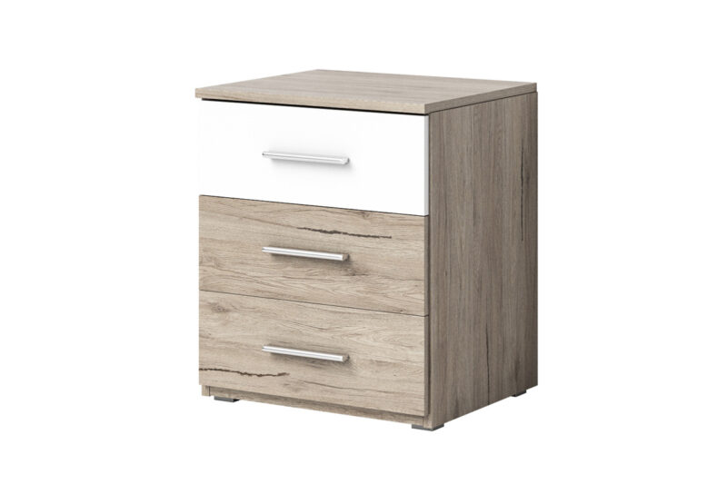 Nočný stolík BETKA je súčasťou štýlového spálňového sektoru BETKA. Aj vďaka nemu si vytvoríte vysnívanú spálňu podľa vašich predstáv. Stolík je vyrobený z kvalitných LTD dosiek, ktoré sú nenáročné na údržbu. Farebné prevedenie je v kontraste farieb: Dub San Remo, biela. Nočný stolík disponuje tromi praktickými zásuvkami. Rozmery (š,v,h): 46 x 55 x 41 cm. Spálňový nábytok BETKA zaujme milovníkov praktických riešení v spojení s elegantným a štýlovým dizajnom. Vynikajúco premyslená kombinácia funkčnosti s trendmi nábytku je pre sektor BETKA samozrejmosťou. V ponuke aj iné farebné prevedenie. Dodávame v demontovanom stave.