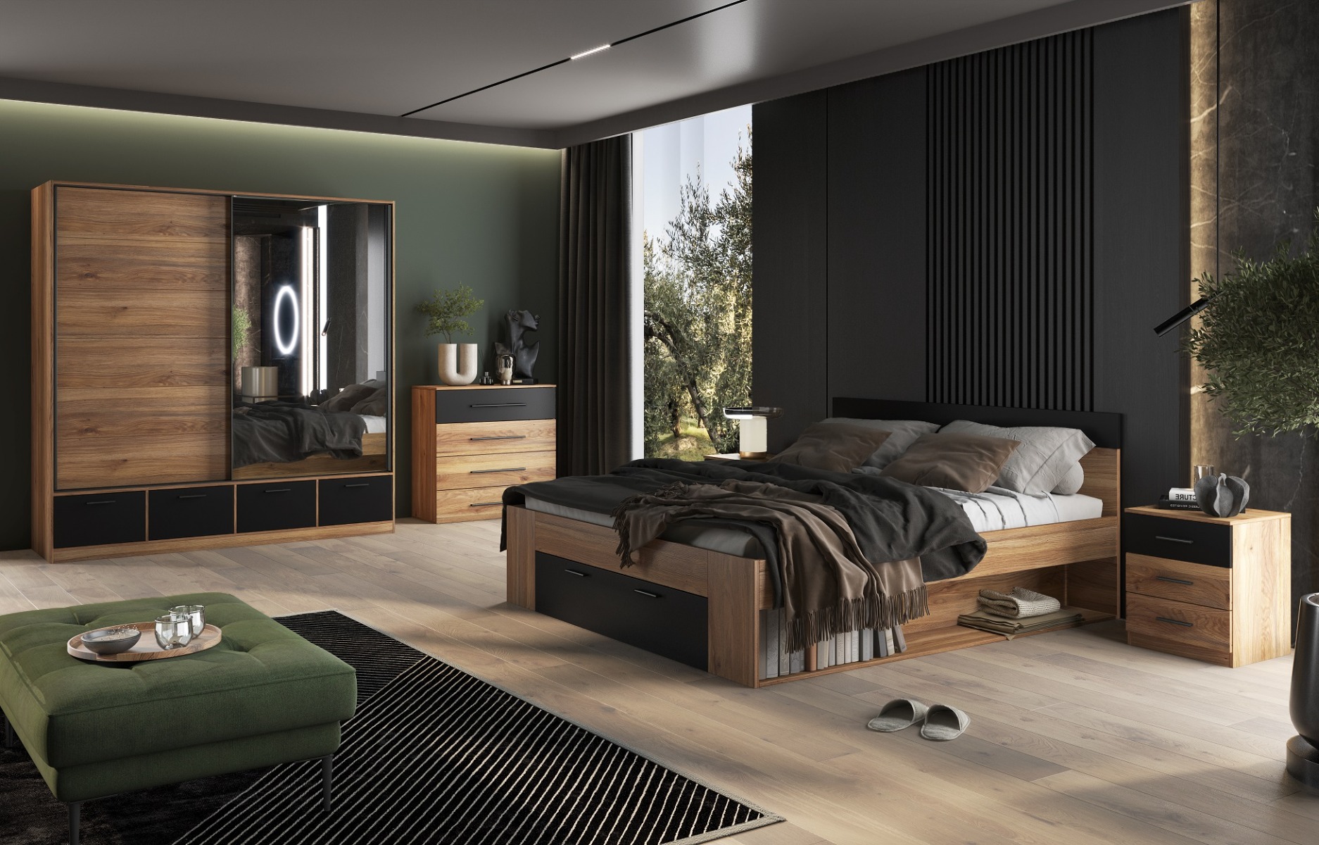 Spálňová zostava BETKA je súčasťou štýlového spálňového sektoru BETKA.Zostava je vyrobená z kvalitných LTD dosiek, ktoré sú nenáročné na údržbu. Farebné prevedenie je dub Mauvella. Spálňová zostava sa skladá z:2 x nočný stolík – rozmery (š,v,h): 46 x 55 x 41 cmmanželská posteľ 180 – rozmery (š,v,h): 186 x 92 x 218 cmšatníková skriňa – rozmery (š,v,h): 200 x 209 x 61 cmzásuvková komoda – rozmery (š,v,h): 91 x 92 x 40 cmSpálňový nábytok BETKA zaujme milovníkov praktických riešení v spojení s elegantným a štýlovým dizajnom. Vynikajúco premyslená kombinácia funkčnosti s trendmi nábytku je pre sektor BETKA samozrejmosťou. V ponuke aj iné farebné prevedenie.Dodávame v demontovanom stave.