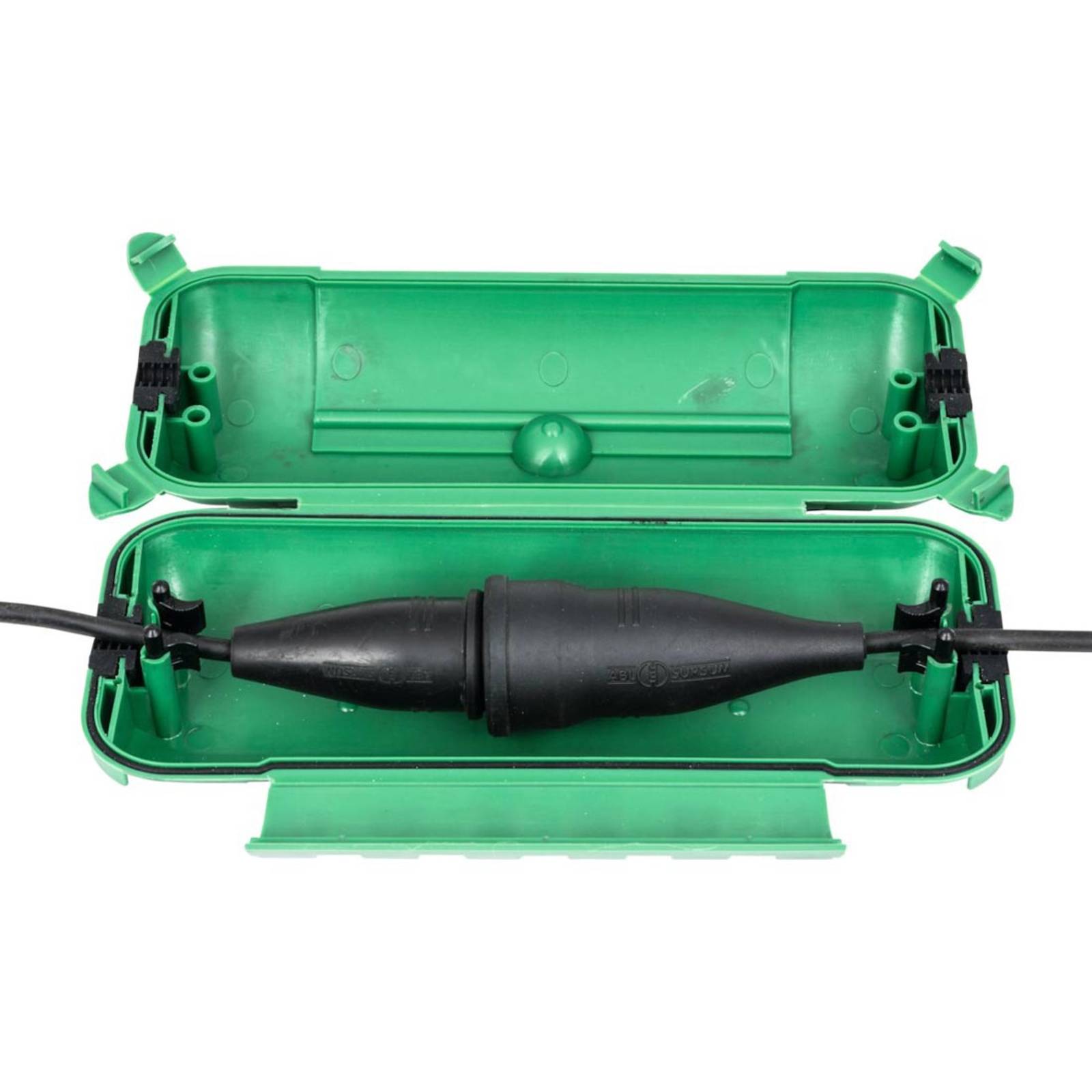 Bezpečnostná skrinka Max chráni káblové a spojovacie spojenia vonku Táto bezpečnostná schránka je vyrobená z plastu a robí vynikajúcu prácu vo vonkajšom prostredí. B. účinne chráni prívodné vedenia vianočného alebo festivalového osvetlenia alebo elektrických zariadení pred vniknutím striekajúcej vody. Utesnené silikónom a opatrené gumovými tesneniami pre zátky a spojky. Vhodný aj pre zásuvné transformátory IP20. – ideálne pre kempovanie a záhradu – Stupeň krytia IP44