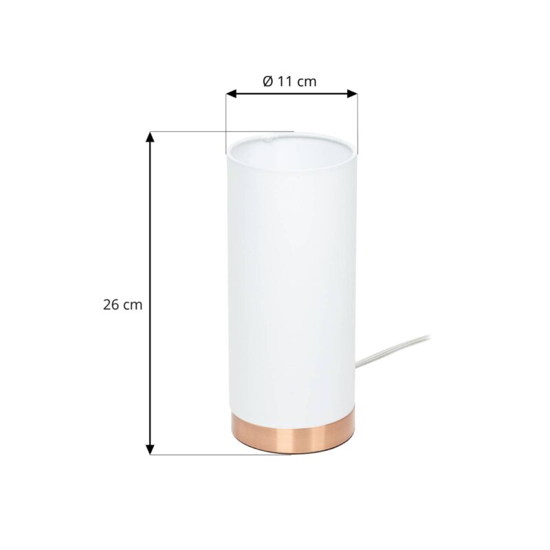 Zaujímavé stolové svietidlo Ronja s bielym textilným tienidlom a medeným podstavcom – 3 úrovne jasu Vrcholom dizajnu tohto veľmi decentného stolového svietidla je bez pochýb okrúhly podstavec s moderným medeným lakovaním, pretože ten je dôvodom, prečo sa Ronja úplne odlišuje od iných exemplárov svojho druhu. Látkové tienidlo vyzerá akoby bolo plynule prepojené s podstavcom, takže tvar jednoducho pokračuje a rozdiel je viditeľný iba vo farbe a materiáli. Biely látkový povrch vytvára veľmi pekný svetelný efekt, ktorý v miestnosti prispieva k väčšej útulnosti a povzbudzuje prítomných, aby sa uvoľnili a užili si príjemný večer. Ako stolové svietidlo je Ronja vynikajúco vhodná na používanie na nočnom stolíku alebo príručnom stole v obývačke. V oboch prípadoch sa integrovaný 3-úrovňový dotykový stmievač ukáže ako veľmi užitočný, pretože, keď sa dotknete podstavca, svetlo sa zapne na najnižšej úrovni jasu a pri ďalších dvoch dotykoch sa jas postupne zvyšuje, až kým nakoniec nedosiahne maximálnu hodnotu. Ďalším radom dotykov sa potom stolové svietidlo opäť vypne.
